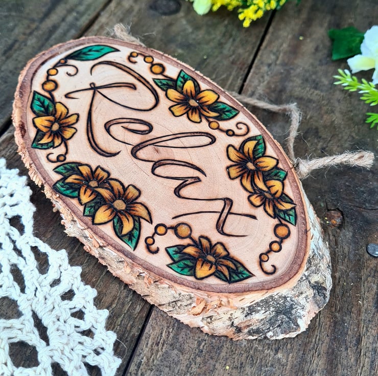 Pyrography is used to hand burn one of my designs onto a smooth sanded live edge log slice, the addition of a touch of colour and some hanging twine, all together makes for a unique piece that is finished with a layer of matt varnish to give a natural look whilst providing protection.