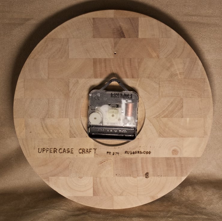 The numerals are small pebbles I have taken from our garden here at Clairdale, the hands are cut by hand from my own hardwood veneer, and are my signature counter-balanced sword shape.
