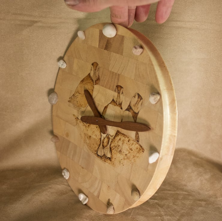 This circular wood wall clock with puffins is hand crafted on Sanday, Orkney. This unique clock is 230mm diameter and has a quartz movement which uses one AA battery (not supplied). The three cheeky puffins (I think they are saying "OO you looking at, human?") are hand drawn using pyrography - the art of burning the subject into the wood with a heated stylus, and the original photo was taken on South Ronaldsay, one of the south isles of the Orkney archipelago. The wood used is rubberwood (felled from a rubber tree plantation) and is an old, reclaimed chopping board.