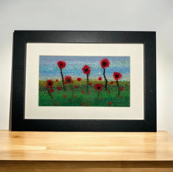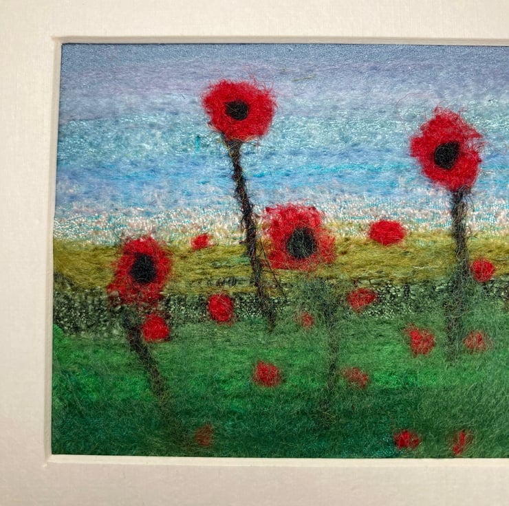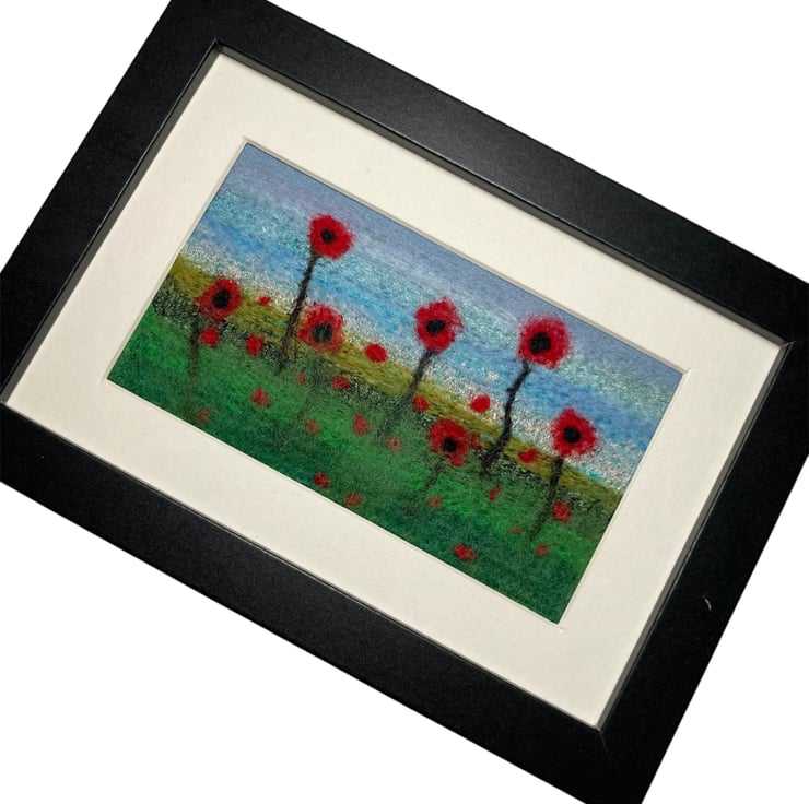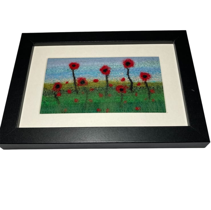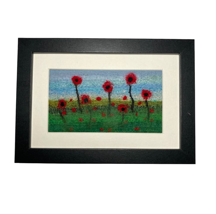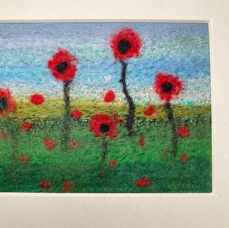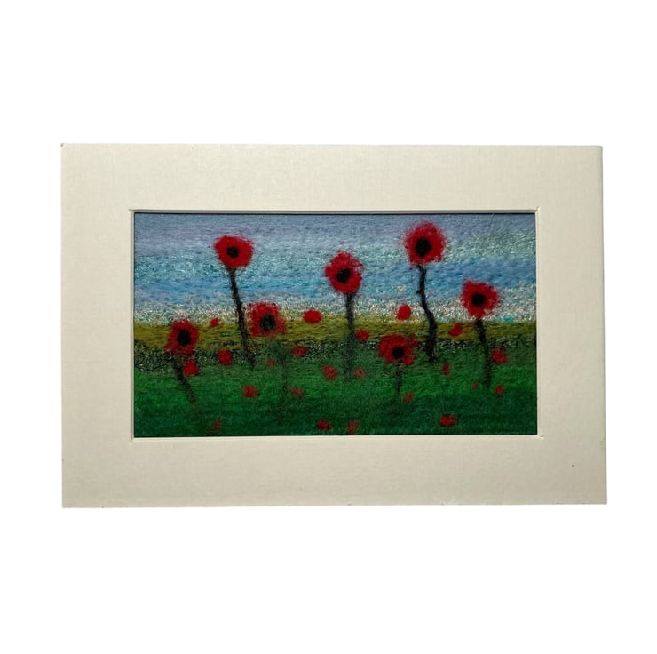 A super little original textile art picture of a field of poppies. The picture has been made by needle felting strips of silk onto a felt background and using woollen fibres to blend the colours. The needle felting technique binds the fabric and fibres together eliminating the need for stitching. After laying down the background, the poppies have been added and a fine layer of woollen "grass" added to the foreground.