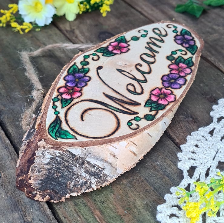 Pyrography is used to hand burn one of my designs onto a smooth sanded live edge log slice, the addition of a touch of colour and some hanging twine, all together makes for a unique piece that is finished with a layer of matt varnish to give a natural look whilst providing protection.