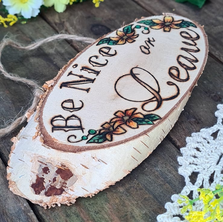 Pyrography is used to hand burn one of my designs onto a smooth sanded live edge log slice, the addition of a touch of colour and some hanging twine, all together makes for a unique piece that is finished with a layer of matt varnish to give a natural look whilst providing protection.