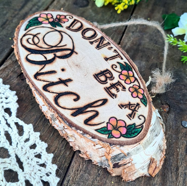Pyrography is used to hand burn one of my designs onto a smooth sanded live edge log slice, the addition of a touch of colour and some hanging twine, all together makes for a unique piece that is finished with a layer of matt varnish to give a natural look whilst providing protection.