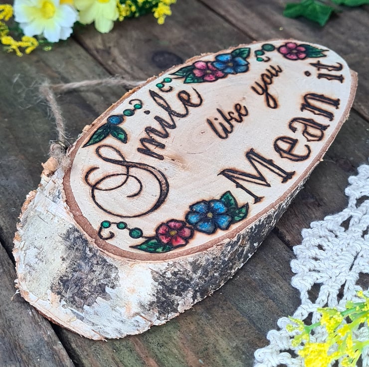 Pyrography is used to hand burn one of my designs onto a smooth sanded live edge log slice, the addition of a touch of colour and some hanging twine, all together makes for a unique piece that is finished with a layer of matt varnish to give a natural look whilst providing protection.