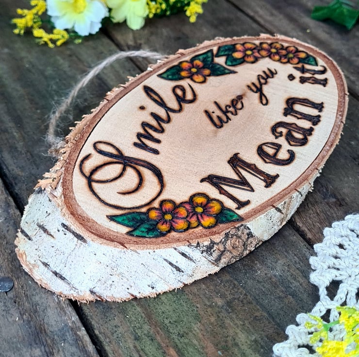 Pyrography is used to hand burn one of my designs onto a smooth sanded live edge log slice, the addition of a touch of colour and some hanging twine, all together makes for a unique piece that is finished with a layer of matt varnish to give a natural look whilst providing protection.