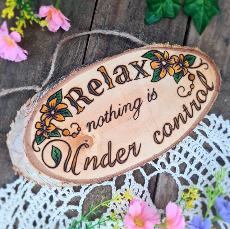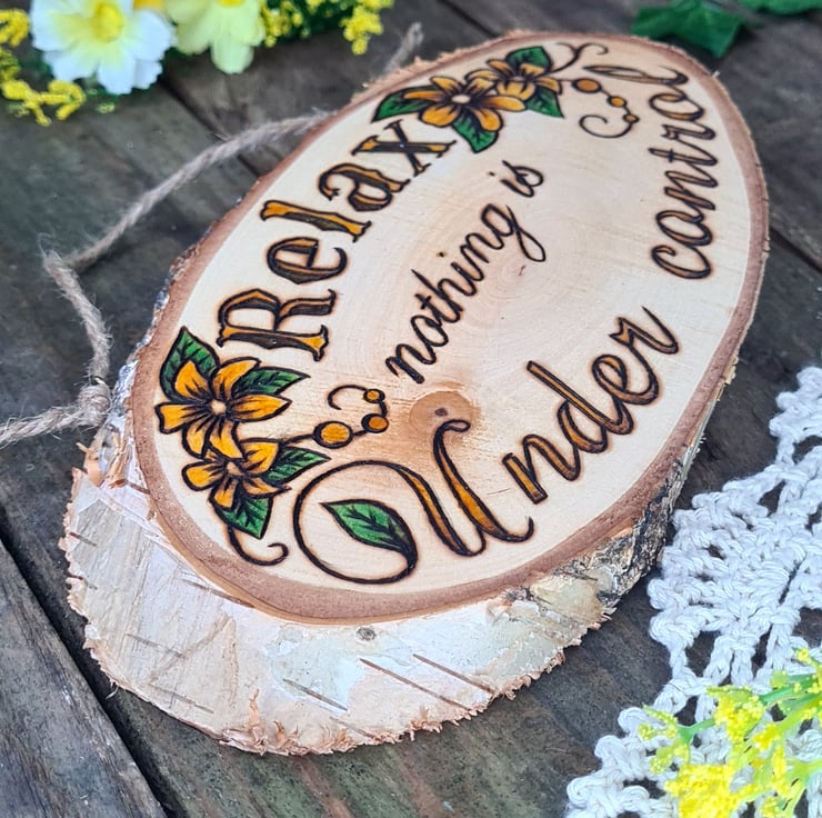 Pyrography is used to hand burn one of my designs onto a smooth sanded live edge log slice, the addition of a touch of colour and some hanging twine, all together makes for a unique piece that is finished with a layer of matt varnish to give a natural look whilst providing protection.