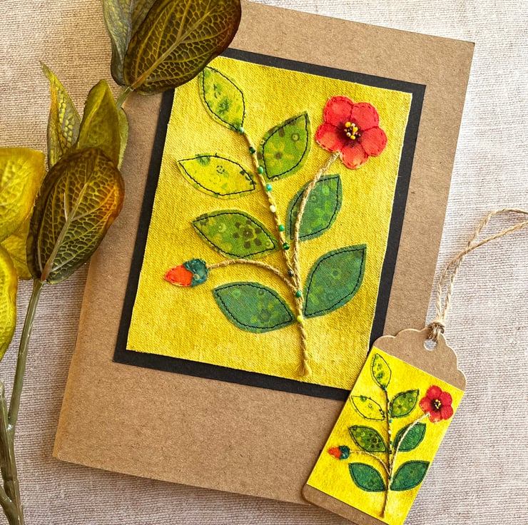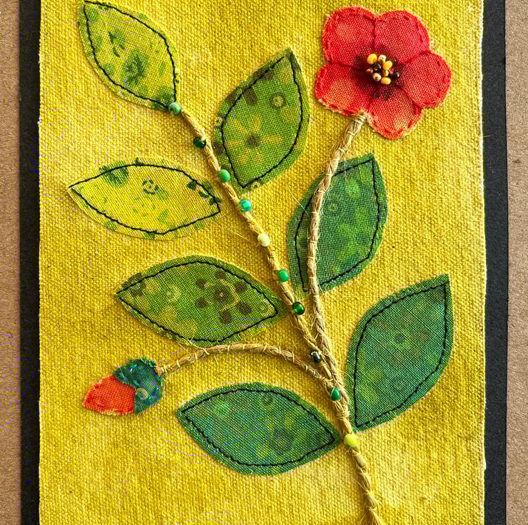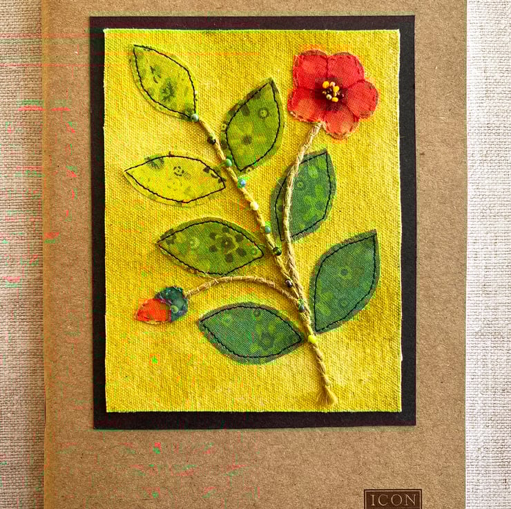 I've added a textile artwork to decorate the cover of this A5 sketchbook. I've used cotton fabric for the leaves and painted them with acrylic. The flowers are made with pieces of batik fabric and I've added some seed beads to the centre of the flower and the stem of the plant which has been made with twine. The background fabric has been given a wash with acrylic paints to create a bit of movement and vintage feel.