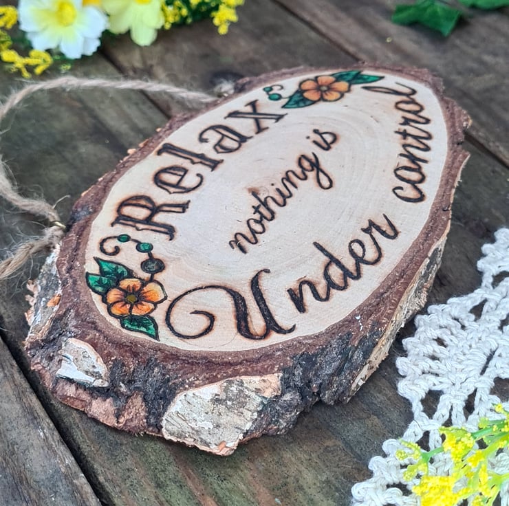 Pyrography is used to hand burn one of my designs onto a smooth sanded live edge log slice, the addition of a touch of colour and some hanging twine, all together makes for a unique piece that is finished with a layer of matt varnish to give a natural look whilst providing protection.