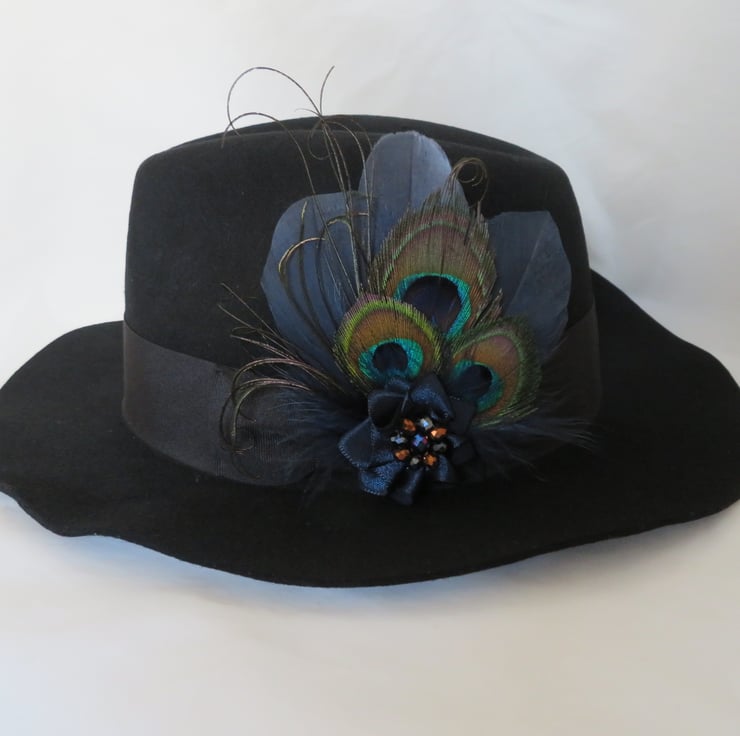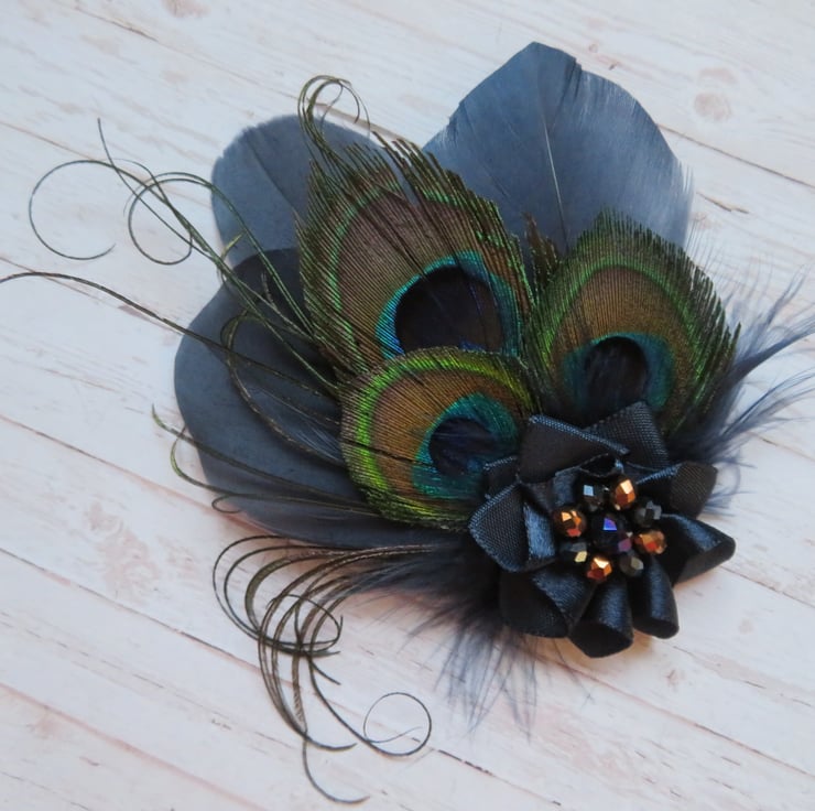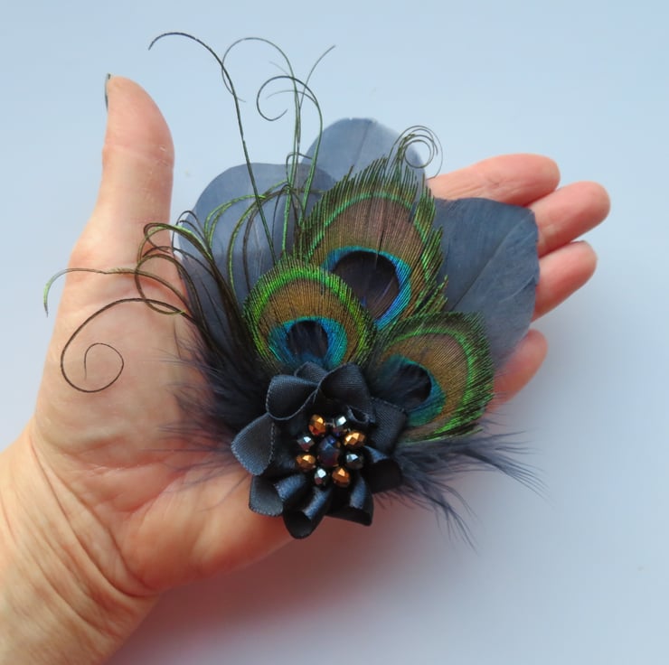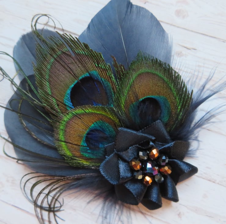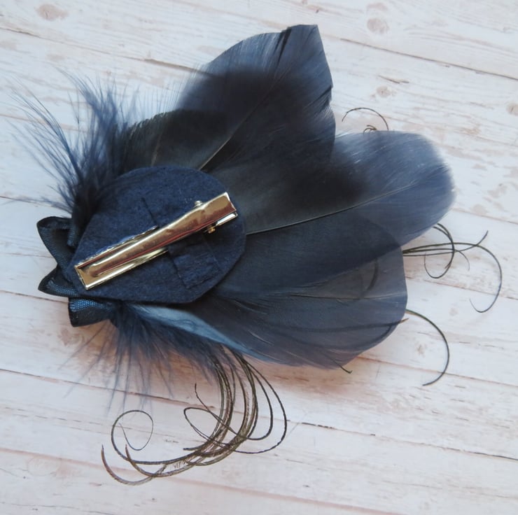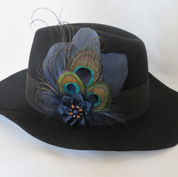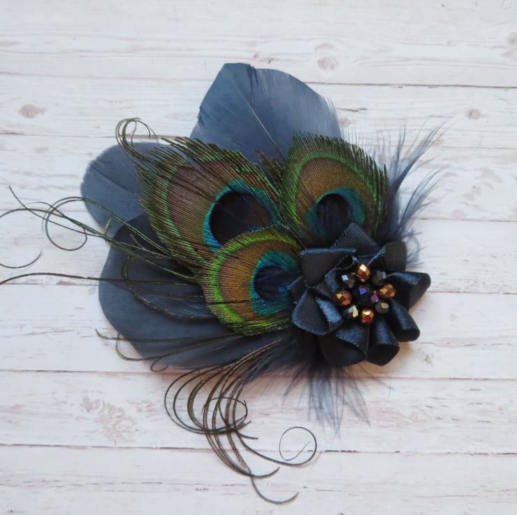 Created with three shaped navy blue goose feathers, three small trimmed peacock eye feathers, navy fluff feathers and curled peacock fronds and finished with a small ruffle of navy satin ribbon with a cluster of navy & copper crystal beads.