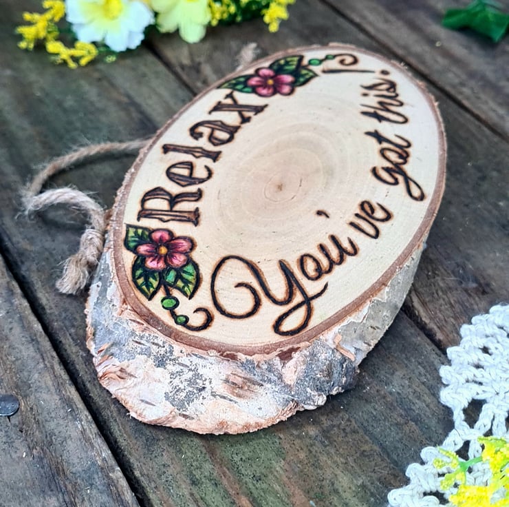 Pyrography is used to hand burn one of my designs onto a smooth sanded live edge log slice, the addition of a touch of colour and some hanging twine, all together makes for a unique piece that is finished with a layer of matt varnish to give a natural look whilst providing protection.
