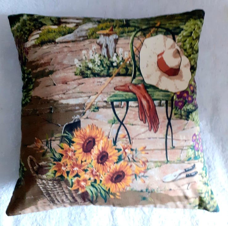 on the garden chair on path cushion with a basket of bright yellow sunflowers and pretty pansies in the border, beside a garden chair with hat and gardening gloves on it, on the path there is a pair of secateurs, behind the chair is a sundial and rockery. A lovely bright cushion.
