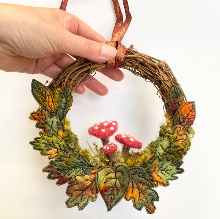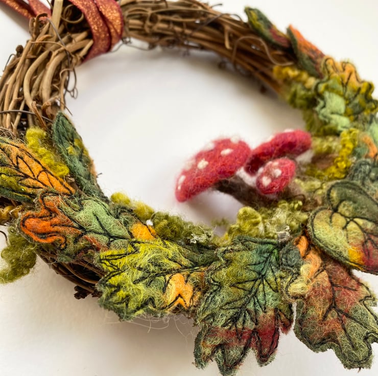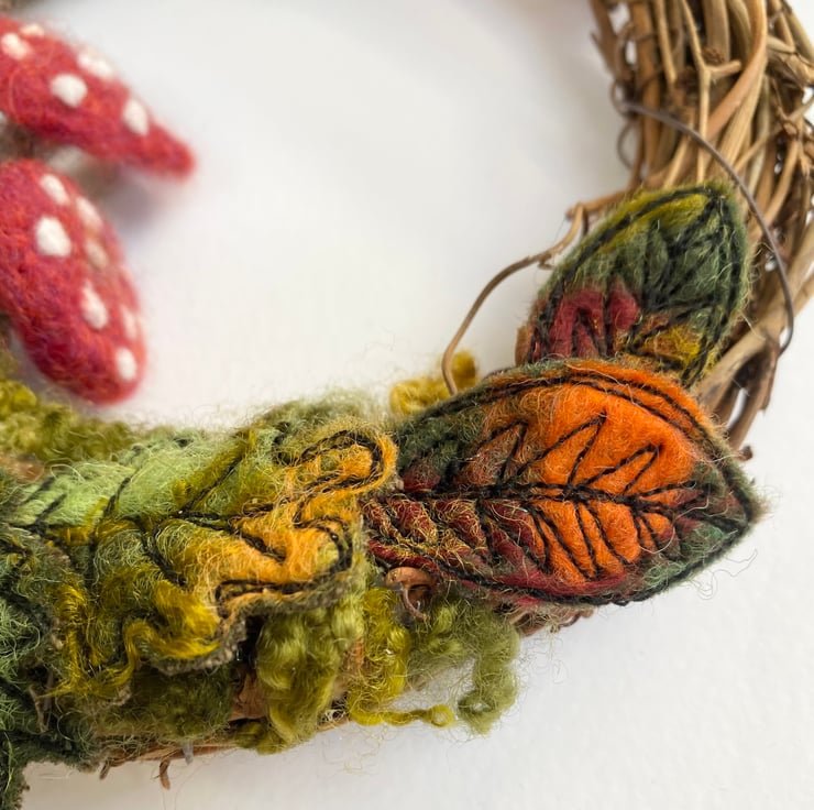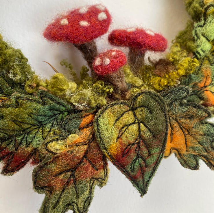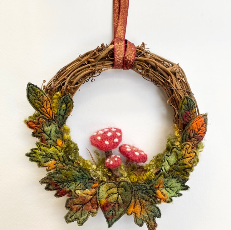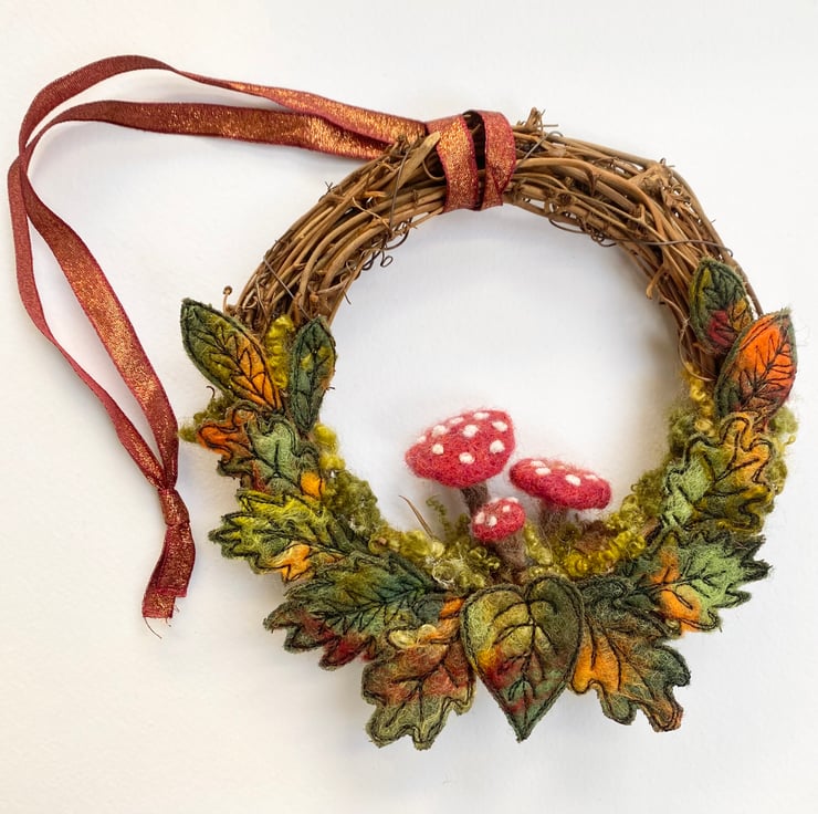 This stunning wreath has been created with individually made felted and embroidered leaves with needle felted mushrooms, enhanced with moss locks. Perfect to add some extra beauty to your home, to hang inside or on your wall, shelf or window. It would make a fabulous birthday gift or house warming present. Not recommended for external use.