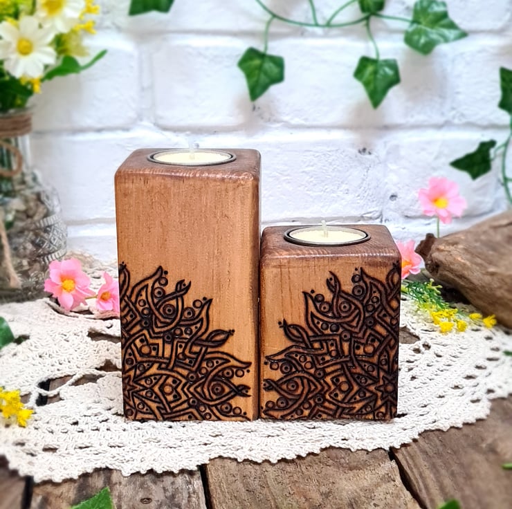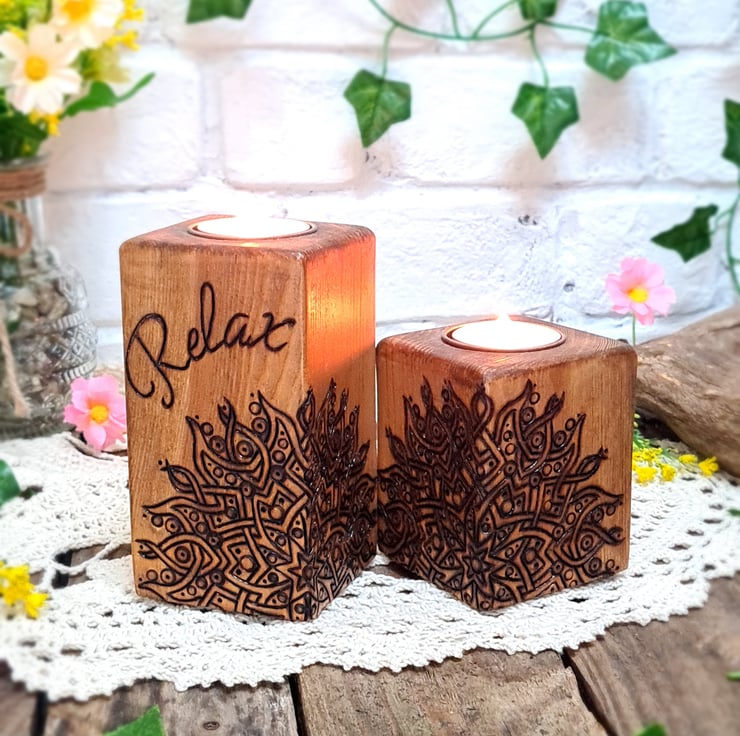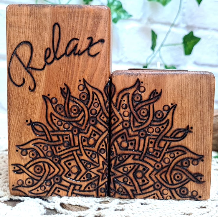 Pyrography is used to hand burn one of my mandala designs onto all four sides of each holder, various designs can be displayed depending on the position of each holder, the addition of the word 'Relax' and metal inserts that house two standard sized tealights all together makes for a unique piece that is then finished with a layer of matt varnish to give a natural look whilst providing protection, along with padded feet to protect the surface.