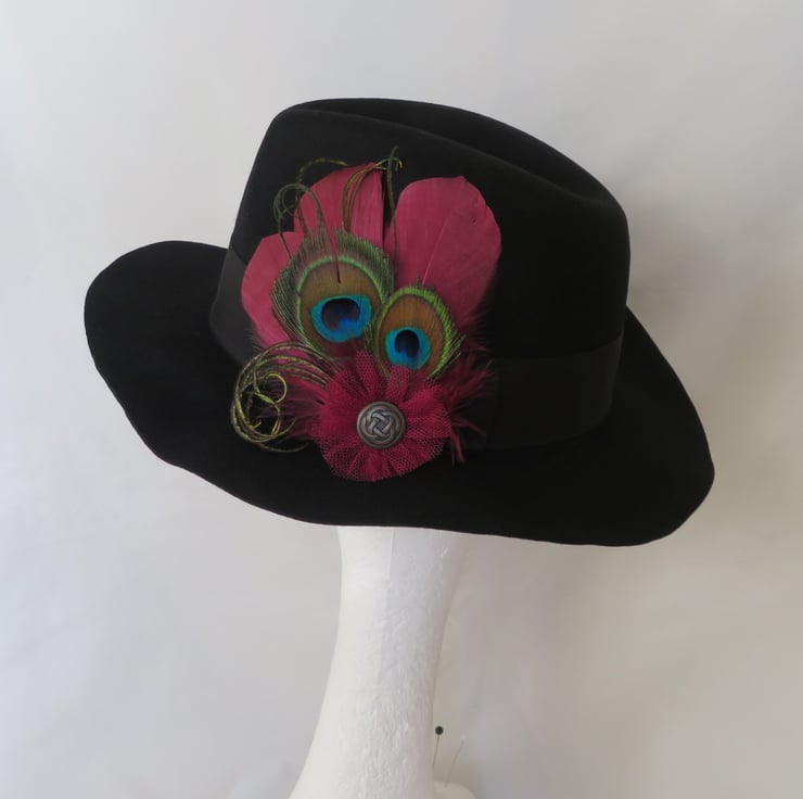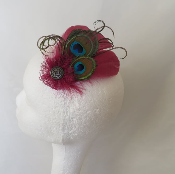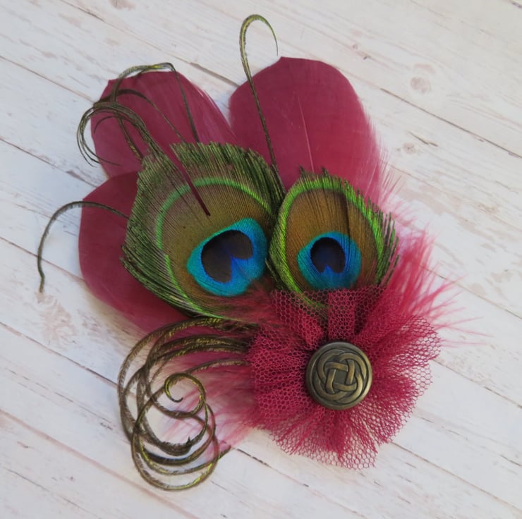 Created with three shaped pale burgundy/ cranberry goose feathers, three small trimmed peacock eye feathers, matching fluff feathers and curled peacock fronds and finished with a small ruffle of matching burgundy tulle with a bronze/ brass tone Celtic metal button.