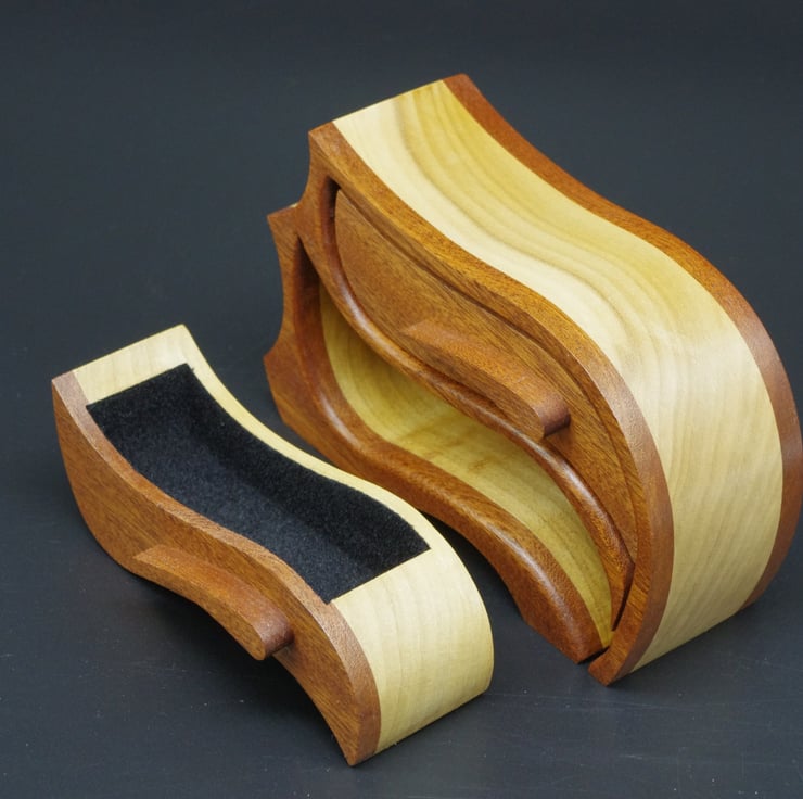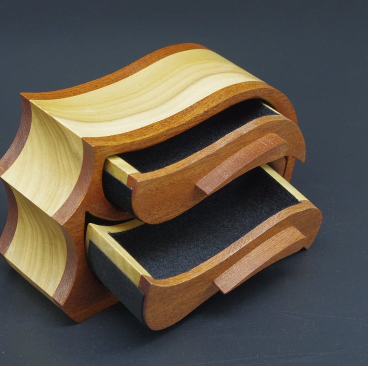 A delightful handmade two drawer wooden trinket, jewel box.