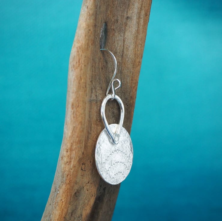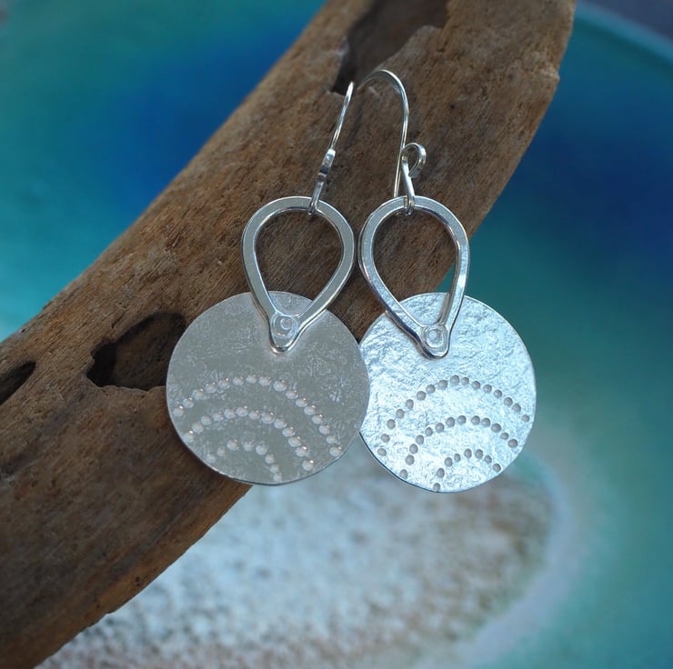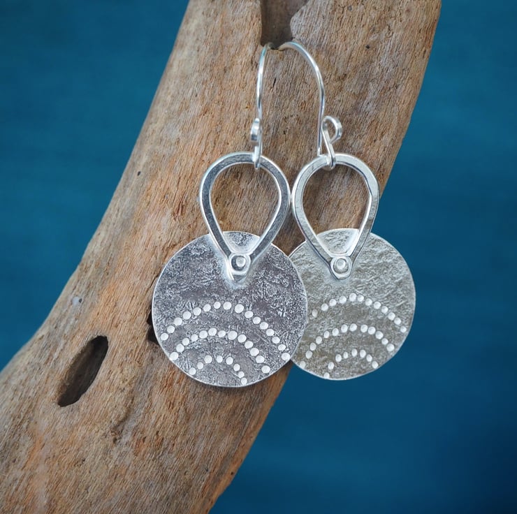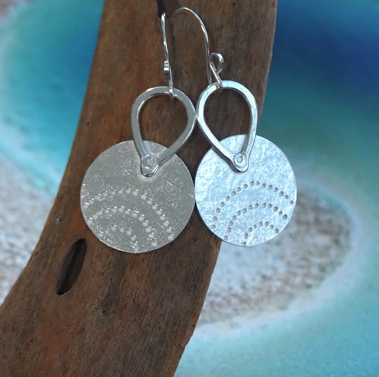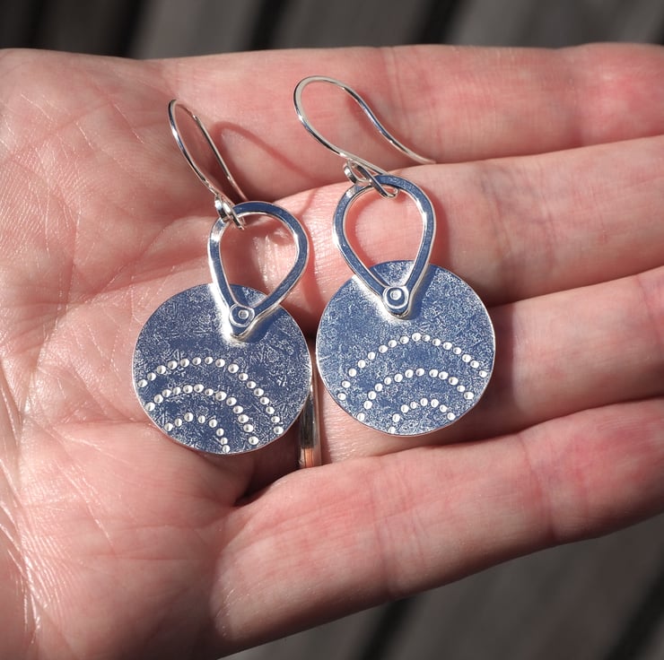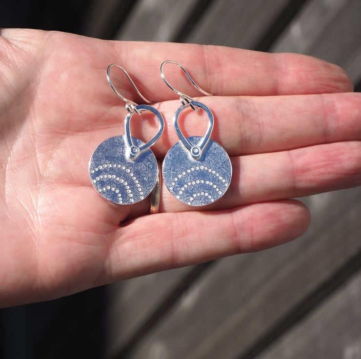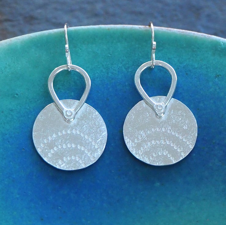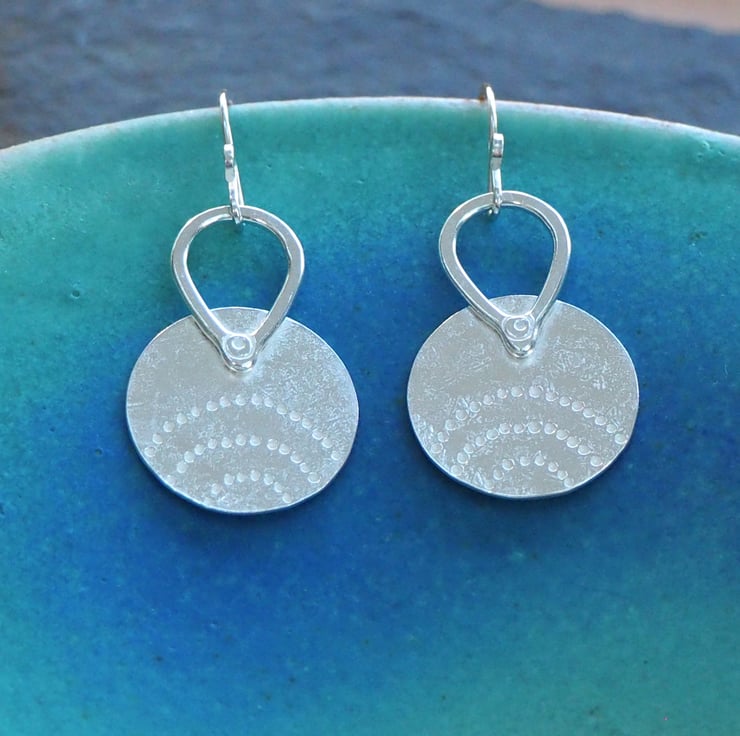 Handmade silver disc earrings with an arc design punched into the surface. They also have texturing from one of my vintage hammers. They hang from handmade ear wires by a tear drop shaped loop.