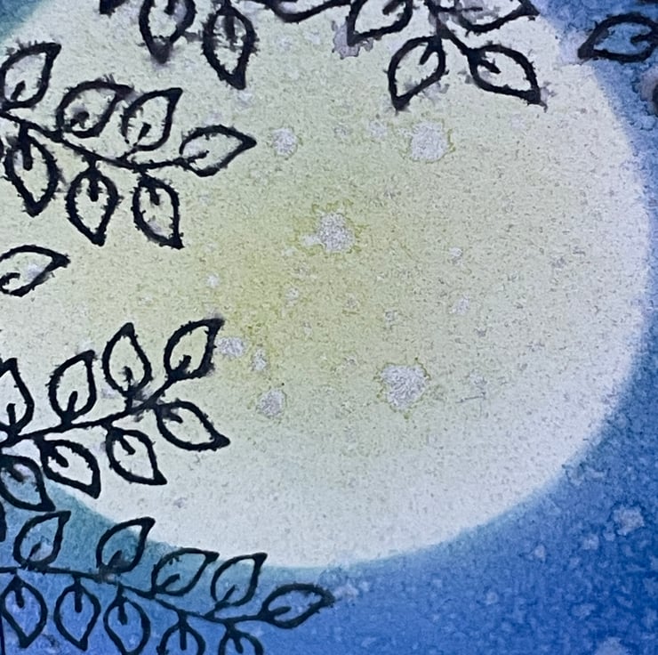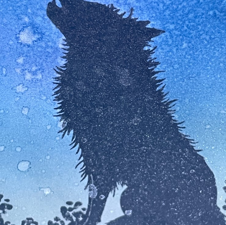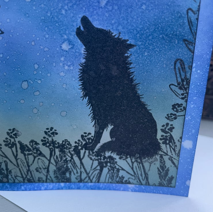 Do you feel the need to howl at the moon? This A6 card could be the one for you. The card features an inked scene of a night sky and a full moon. A silhouette of a wolf is featured and he, or she, is howling at the moon. There are silhouette leaves and foliage around the edge to make a forest type feel. The design is finished with a pearl spray to give a starry sky effect. The design is mounted on a base card that has been inked to match. A versatile card for any occasion you want to send it for - birthday, anniversary, thank you and so on. The choice is yours as there are no greetings on the card at all.