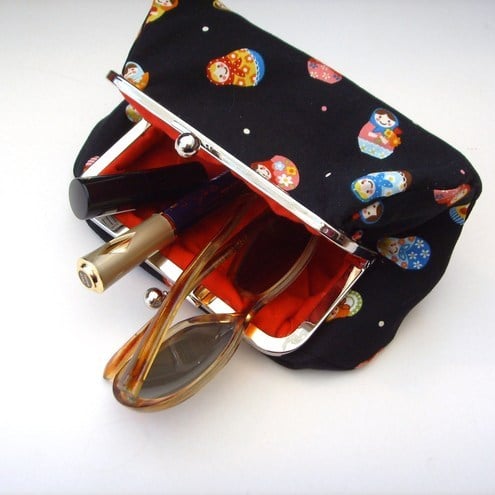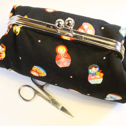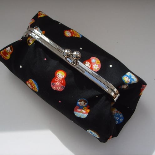 Perfect little clutch for your mobile phone, keys, sunglasses,change and credit cards or even a make-up bag. Pretty black Russian doll fabric with contrasting lining, padding and metal frame clasp.