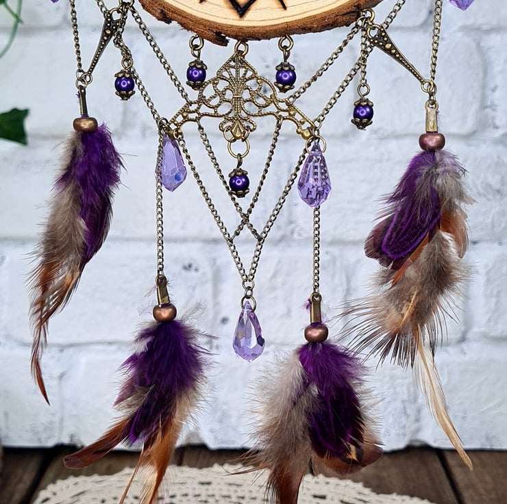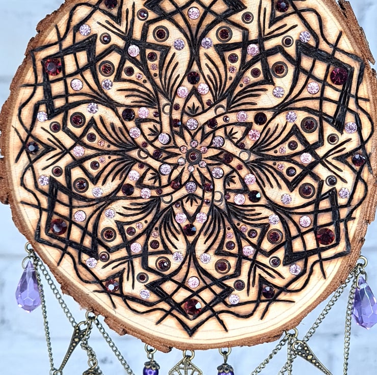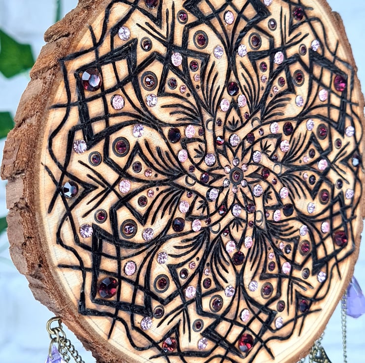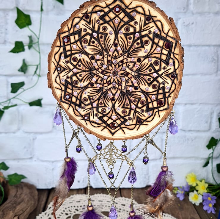 After carefully selecting a live edge log slice, I use the art of pyrography to burn in one of my mandala designs, the dream catcher then comes to life by adding a mix of broken jewellery pieces, some beads, chain, and some matching feathers to create the top and bottom hanging designs, along with some rhinestones for a touch of magic, all together makes for an absolutely unique piece.
