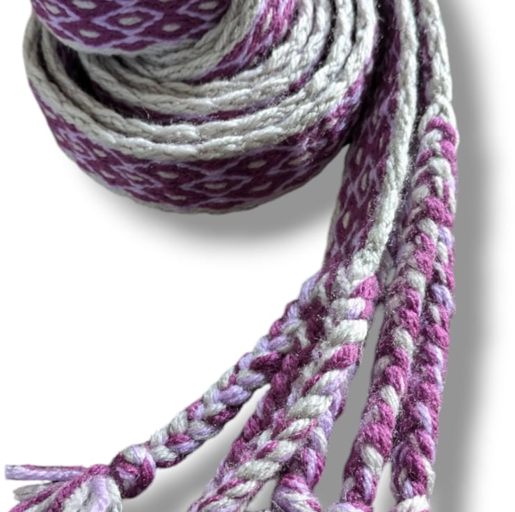 This belt is approximately 200 cm long and 3 cm wide. It features platted tassel ends which contribute an extra 14 cm to the length.