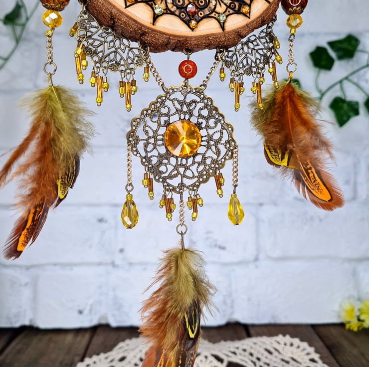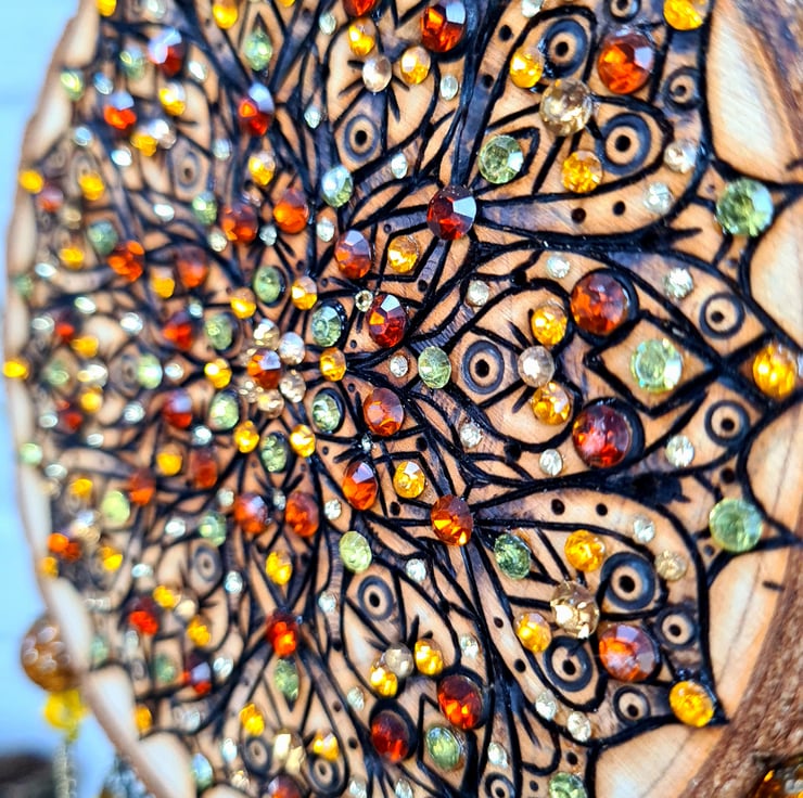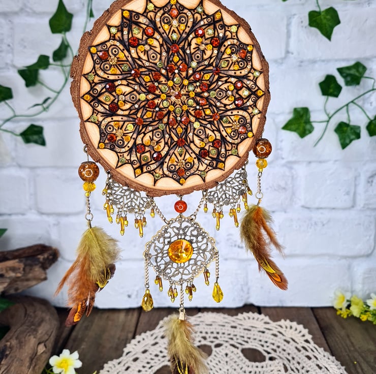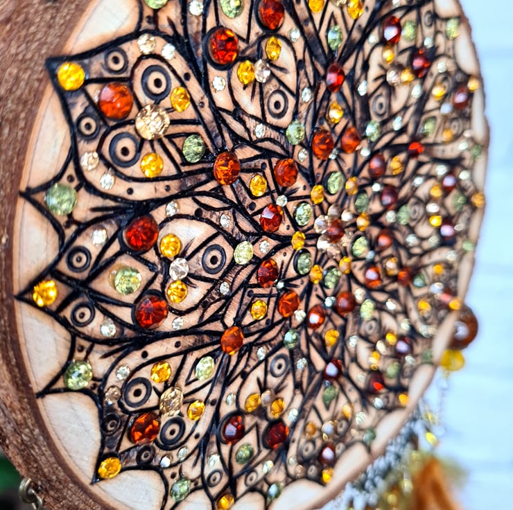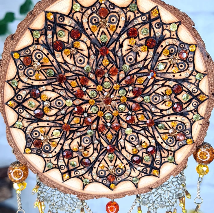 After carefully selecting a live edge log slice, I use the art of pyrography to burn in one of my mandala designs, the dream catcher then comes to life by adding a mix of broken jewellery pieces, some beads, chain, and some matching feathers to create the top and bottom hanging designs, along with some rhinestones for a touch of magic, all together makes for an absolutely unique piece.