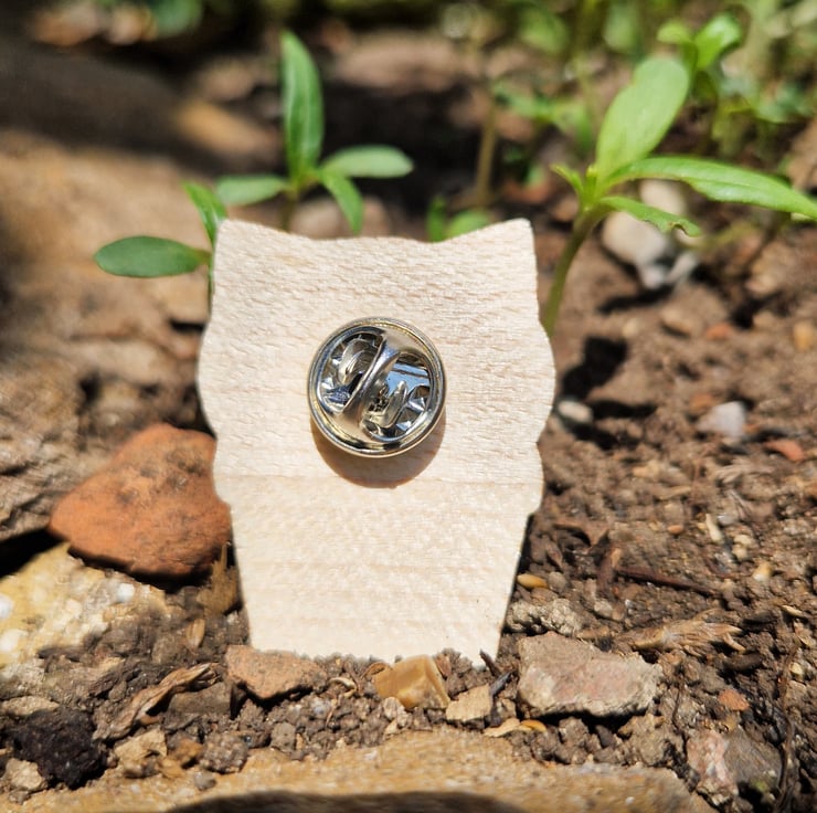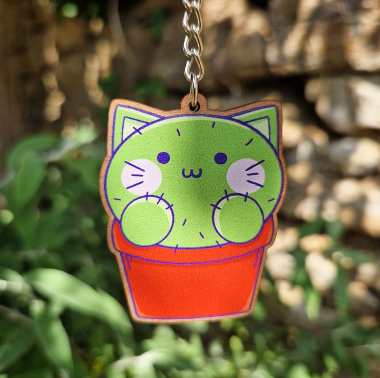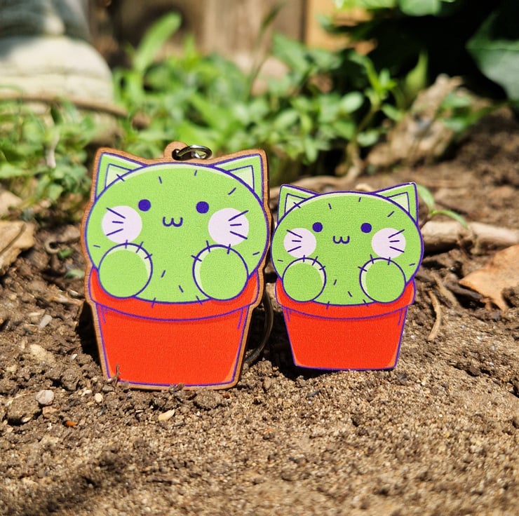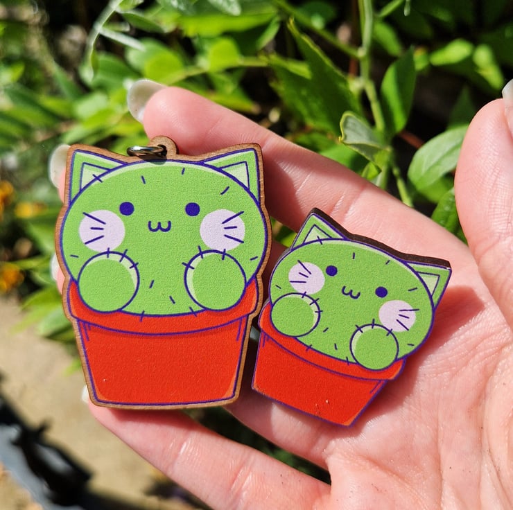 A cat cactus pin made from FSC wood in the UK. This cat pin makes a perfect birthday gift or Christmas gift for cat lovers and plant lovers alike! Comes with a choice of metal or rubber backing, and posted with zero plastic. (I also have this cat cactus available as a keyring in my shop!)