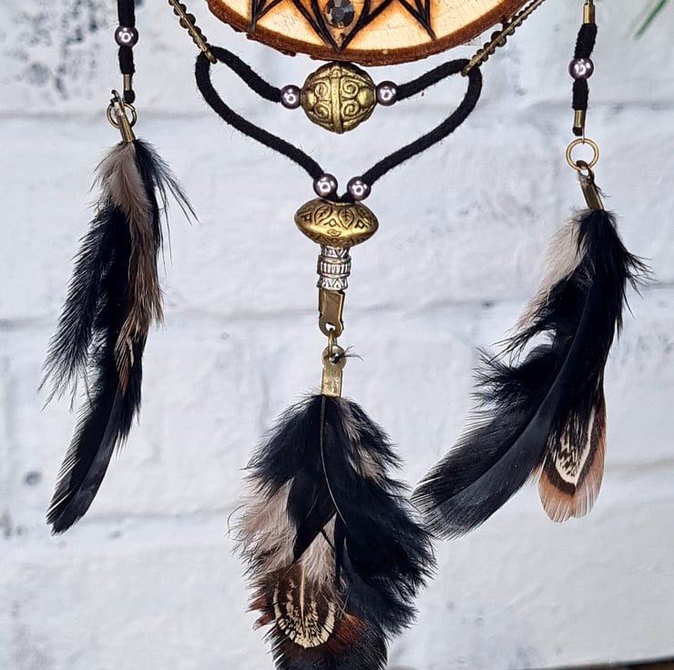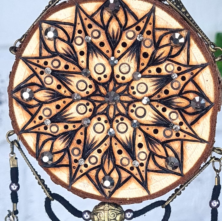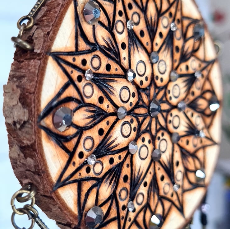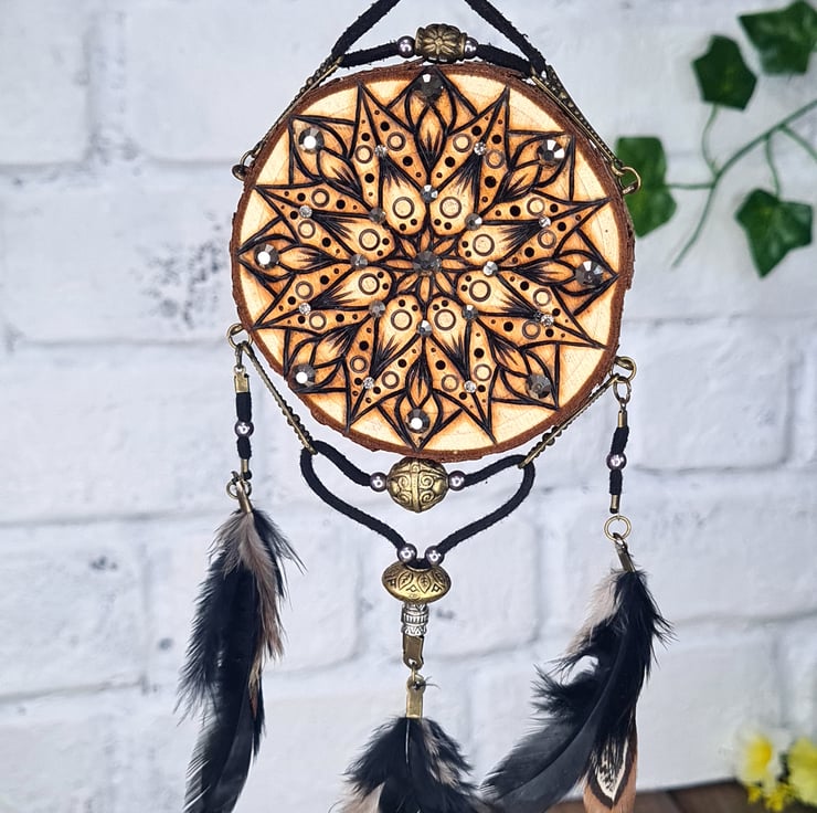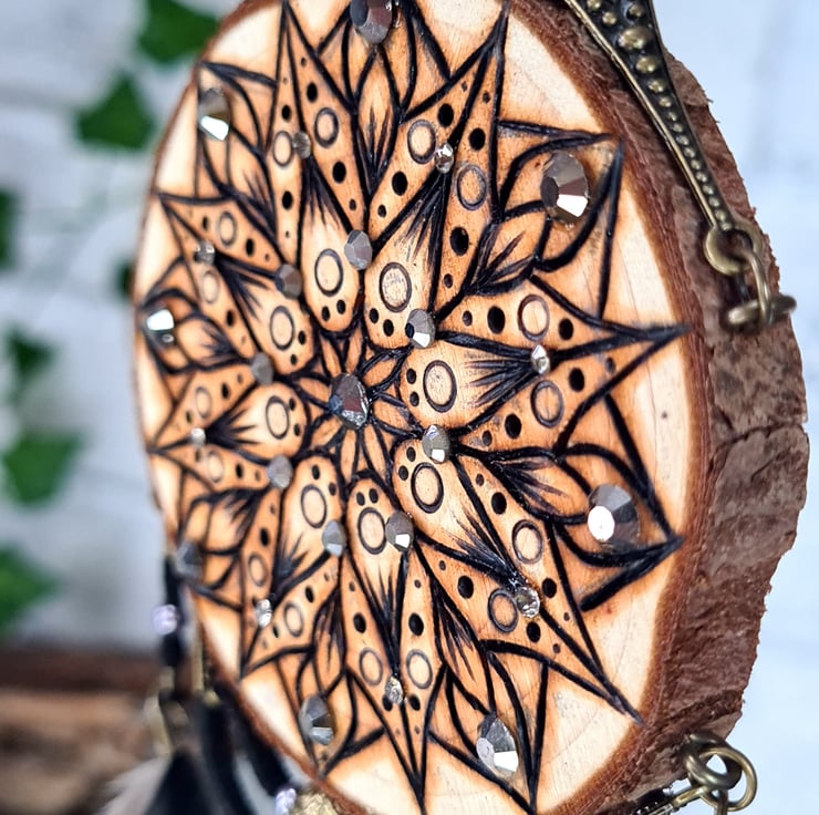 After carefully selecting a live edge log slice, I use the art of pyrography to burn in one of my mandala designs, the dream catcher then comes to life by adding a mix of broken jewellery pieces, some beads, chain, and some matching feathers to create the top and bottom hanging designs, along with some rhinestones for a touch of magic, all together makes for an absolutely unique piece.