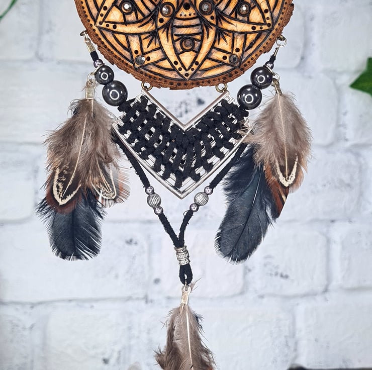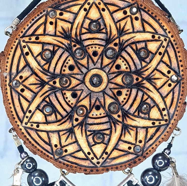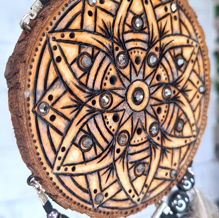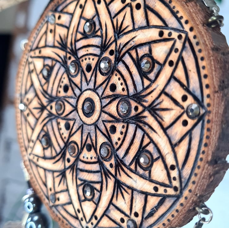 After carefully selecting a live edge log slice, I use the art of pyrography to burn in one of my mandala designs, the dream catcher then comes to life by adding a mix of broken jewellery pieces, some beads, chain, and some matching feathers to create the top and bottom hanging designs, along with some rhinestones for a touch of magic, all together makes for an absolutely unique piece.