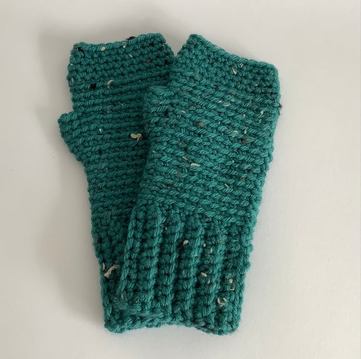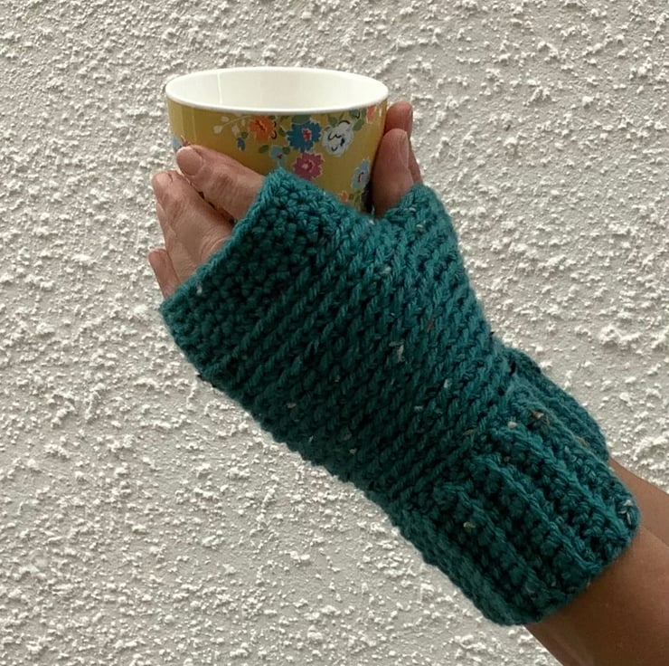 I have designed and crocheted these fingerless mitts / texting mitts ' Valley Tweed ', using a lovely , chunky ( yet lightweight ) Merino wool blend . I've created a relaxed but stretchy wrist section for comfort . They are pretty , practical , warm and cosy.
