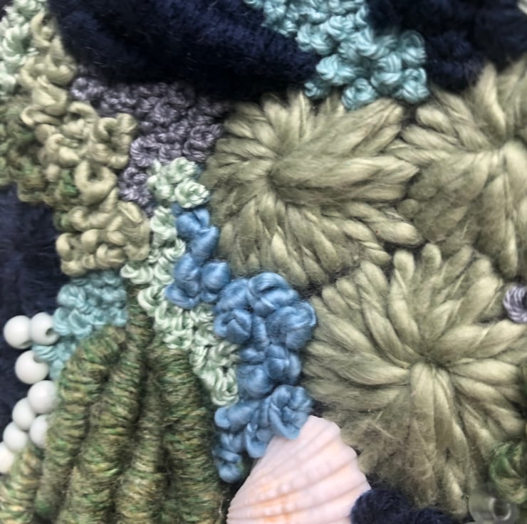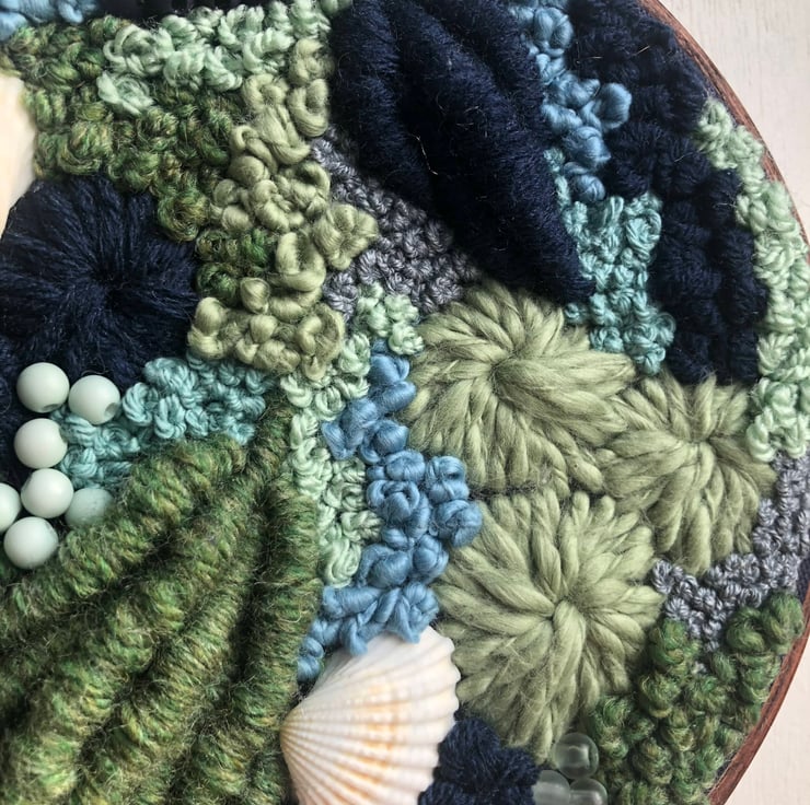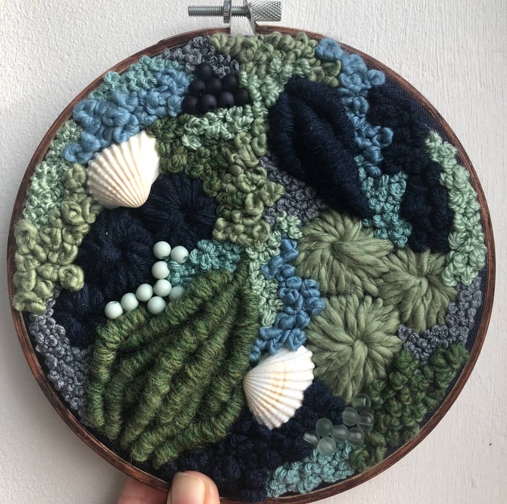 Land and sea a 6 inch one of a kind hand embroidered art piece. Embroidery thread, yarn, beads and shells have been hand embroidered onto a dark blue fabric in an abstract pattern. The finished piece has then been placed in a hand stained dark wood hoop. This has created a piece of art which is both eye catching and unique making it the perfect addition to any home