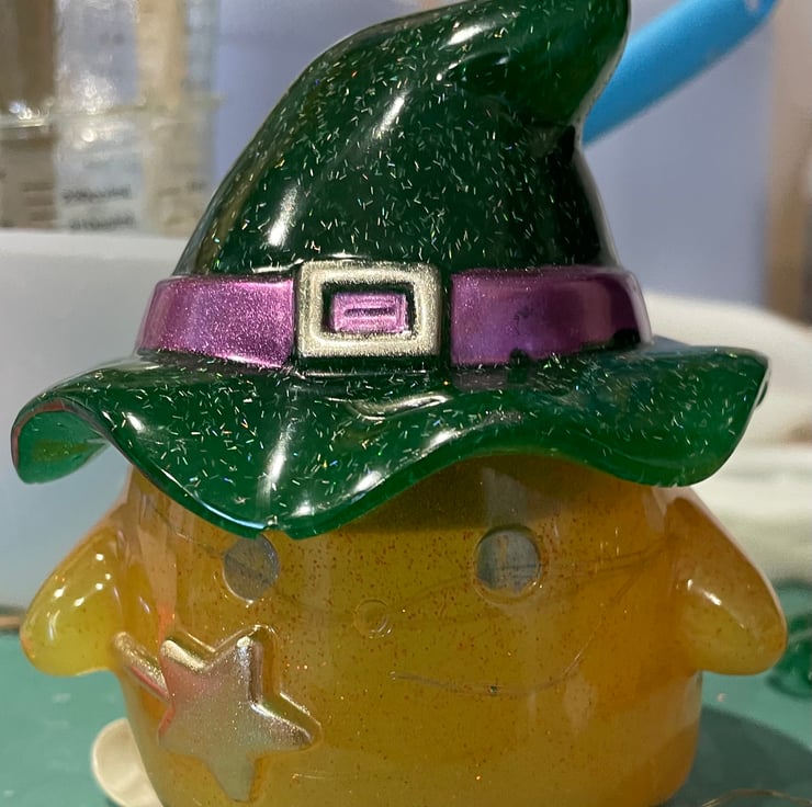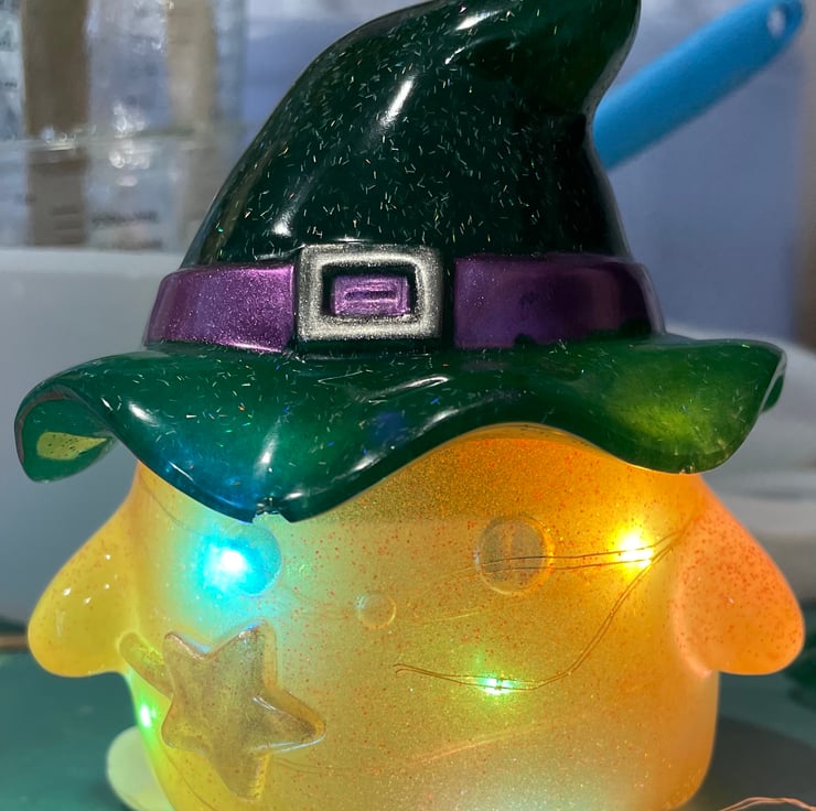 Light up the night with this enchanting Halloween resin jar! Filled with multi-colored lights, this jar casts an eerie glow that’s perfect for creating a spooky vibe. Whether it’s a centerpiece for your Halloween party or a unique decor piece, this jar brings just the right mix of creepy and cozy.