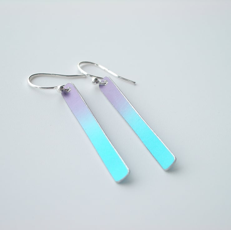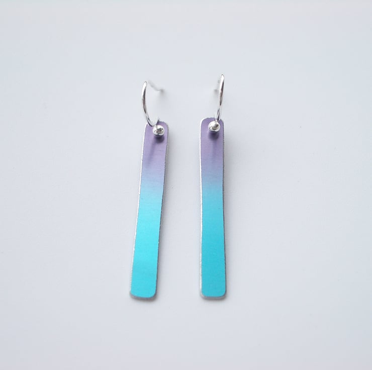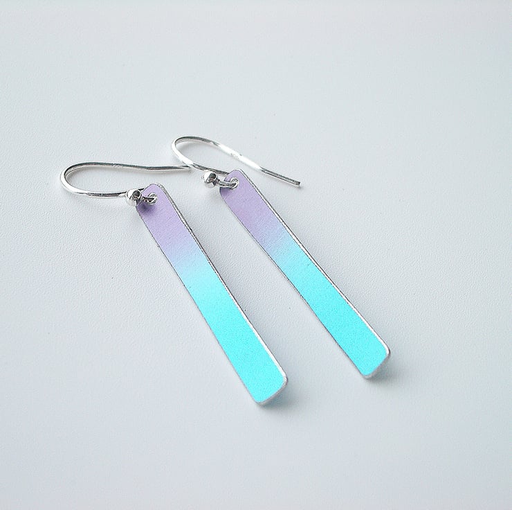 These rectangle earrings are hand made from aluminium which I have dip dyed and sealed so that the dye becomes a permanent part of the metal. They graduate from purple to turquoise and measure approximately 34mm x 4mm. They hang from sterling silver ear hooks.