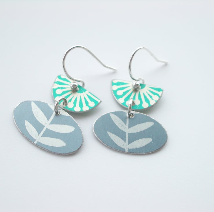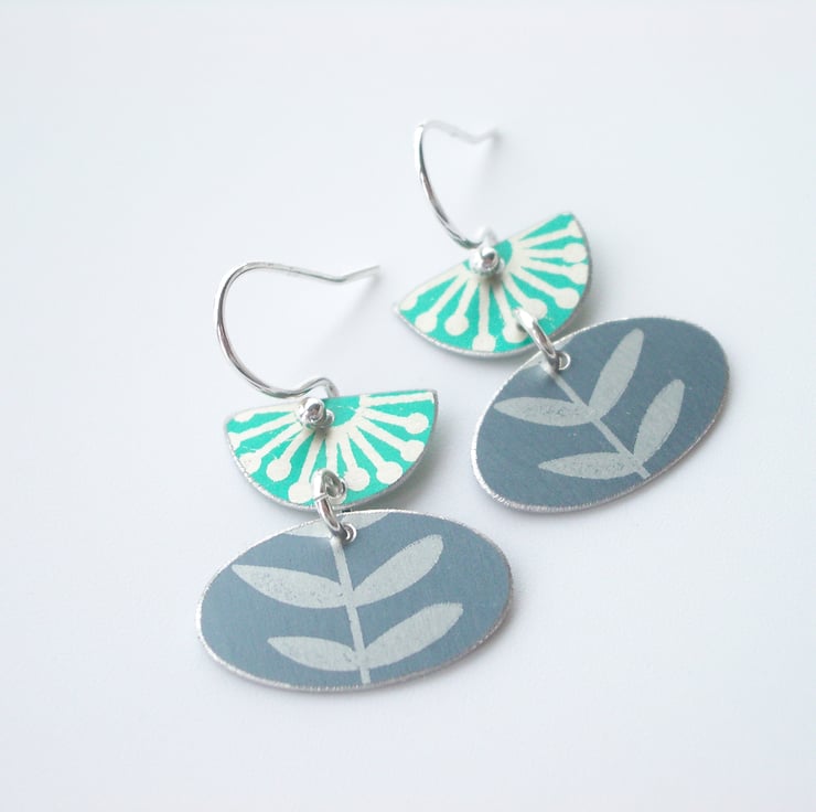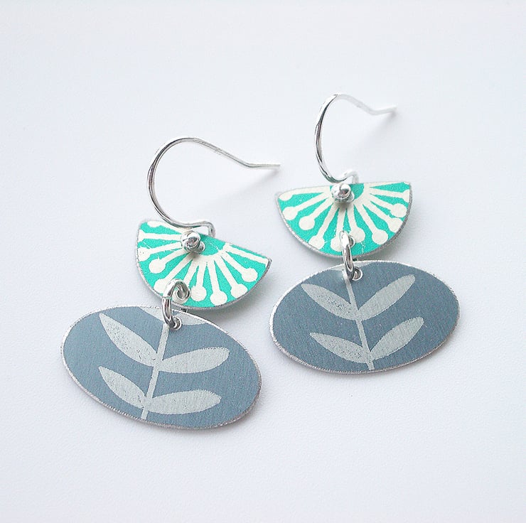 These tulip shaped folk art style flower and leaf earrings are made from anodised aluminium which I have dyed in green and grey and printed with a leaf print. The dye is made permanent by heating the aluminium. I have cut out the semi-circle and pod shape with a piercing saw and filed the edges for a nice smooth finish. The two pieces are linked with a sterling silver hoop and dangle from a sterling silver ear wire. The semi-circle and pod shape together both measure approximately 25mm from top to bottom and the widest part of the pod measures 20mm across