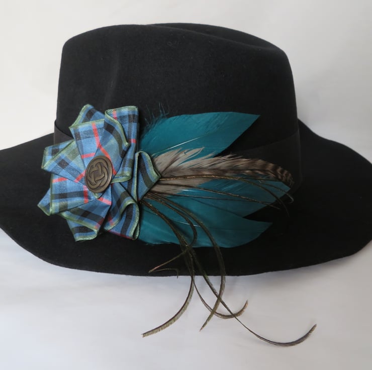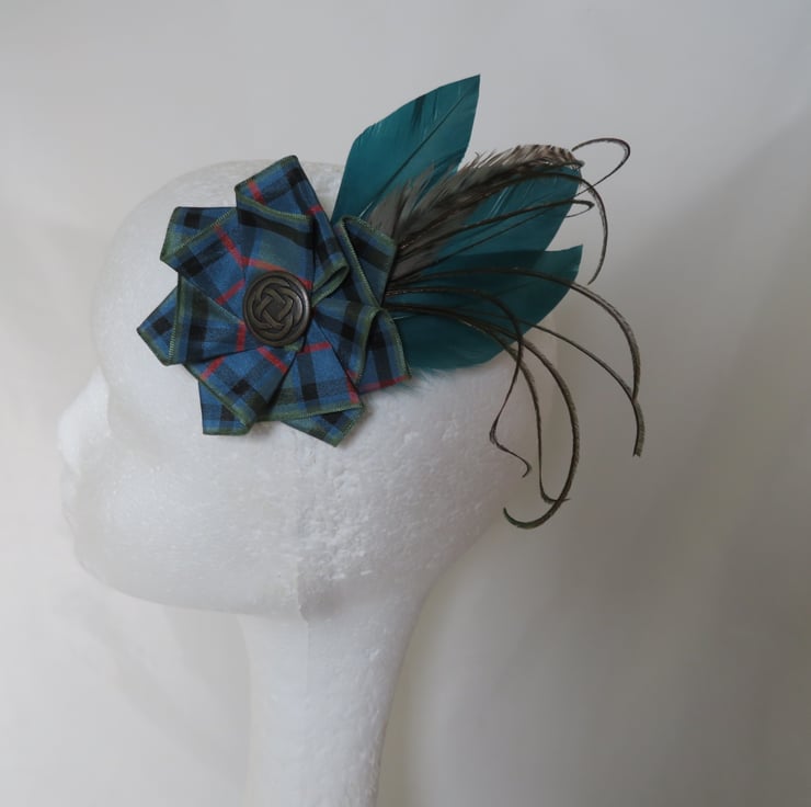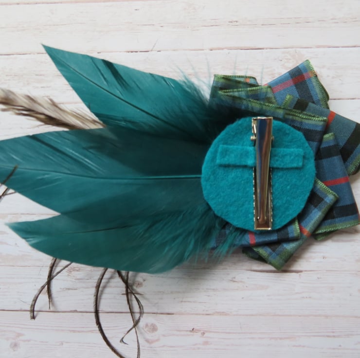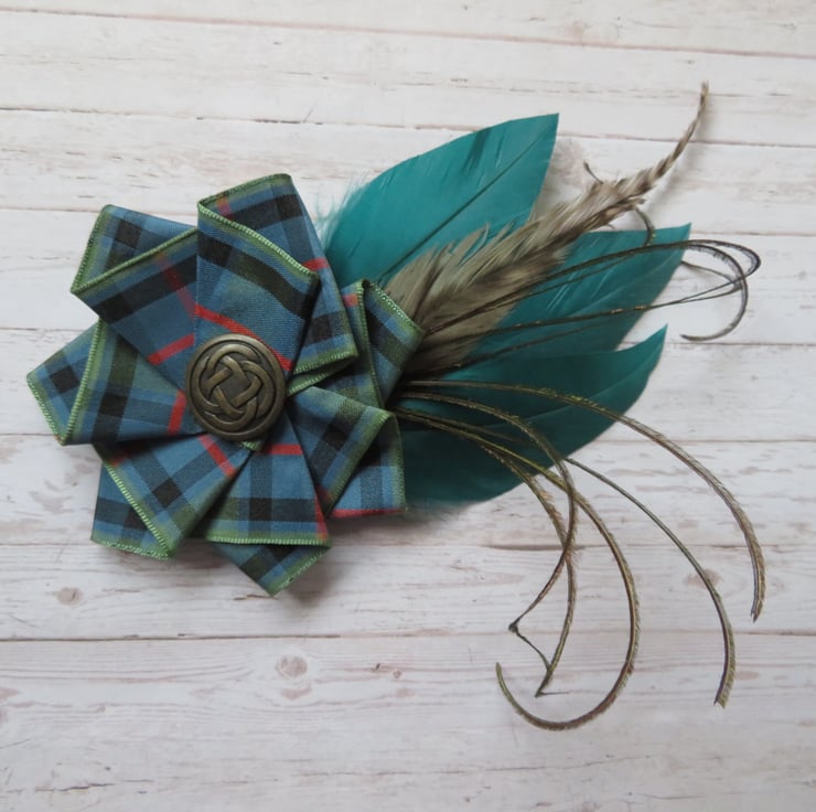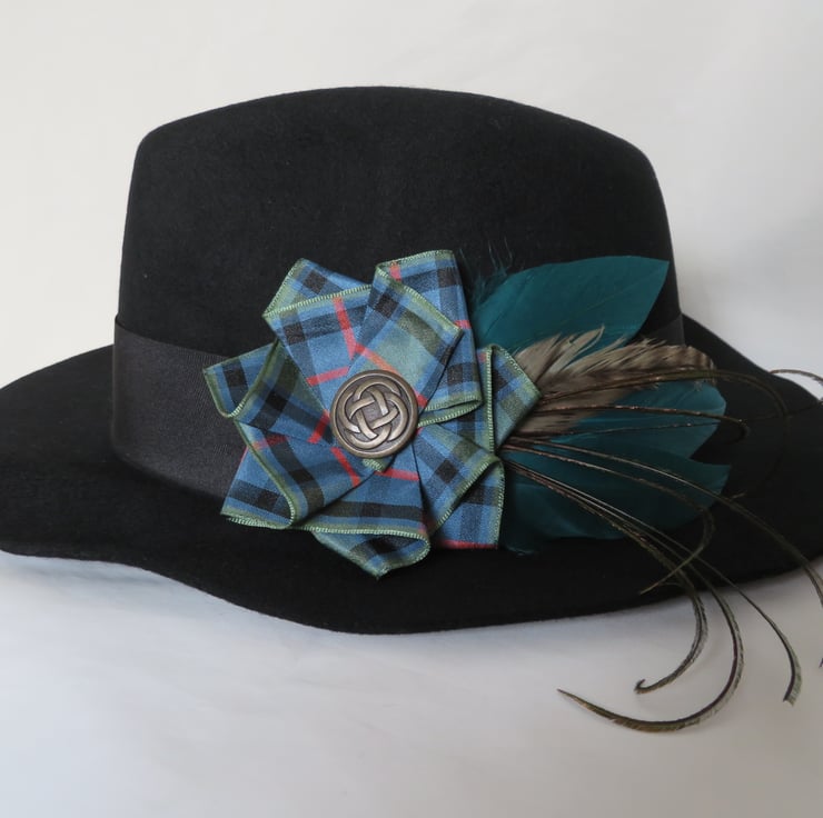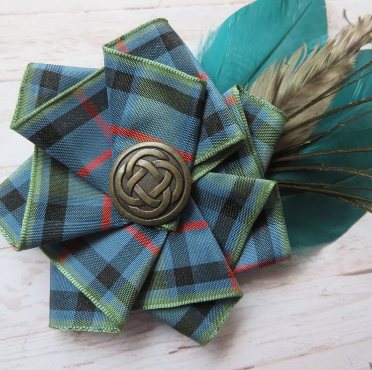 Complemented with a large Flower of Scotland tartan ruffle made with 40 mm wide ribbon and finished with a large Brass Celtic button.