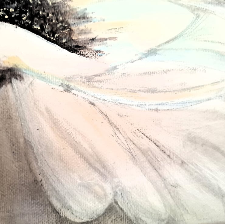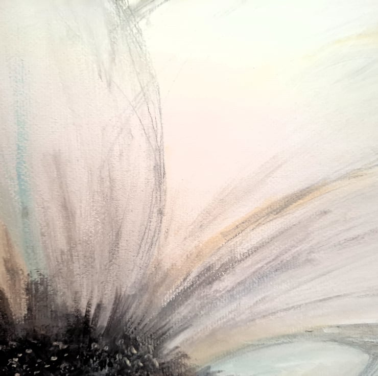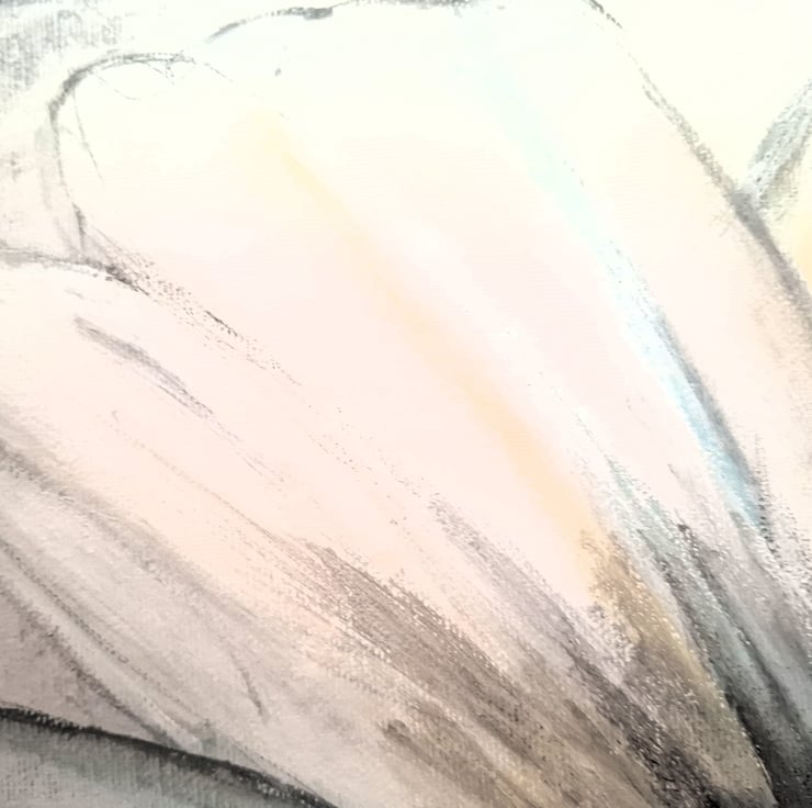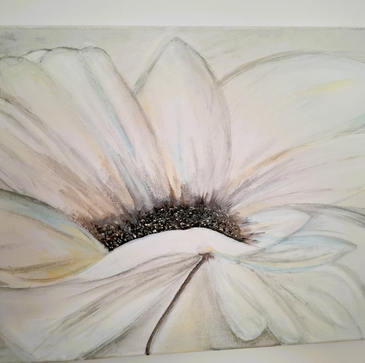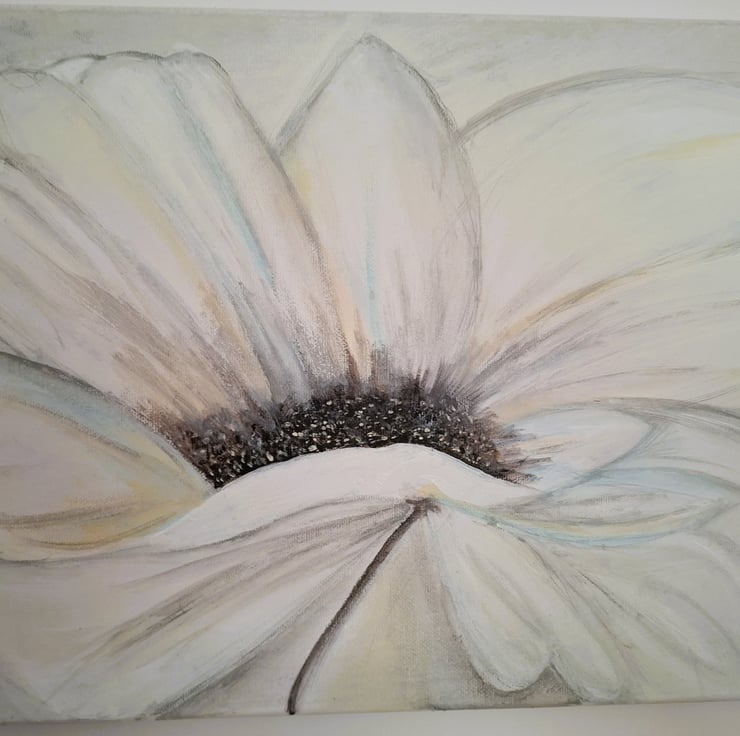 This painting is a very modern abstract flower which I really enjoy painting. I began by painting my background in grey and white, carefully blending and shading the two colours. Then I roughly sketched a flower which I filled in with titanium white, and used the pale blue, pale yellow and a very pale grey to define the individual petals. For me it has turned out a very pretty and calm painting.