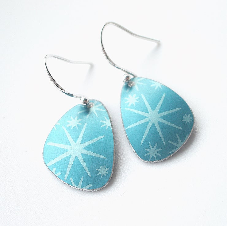 These teardrop shaped earrings are made from aluminium which I have dyed a soft teal blue and printed with a silvery white star print. The dye is made permanent through heat and becomes a part of the metal. I saw pierce the oval shape by hand and finish by doming and filing the edges. The earrings hang from sterling silver ear hooks and measure approximately 20mm x 14mm.