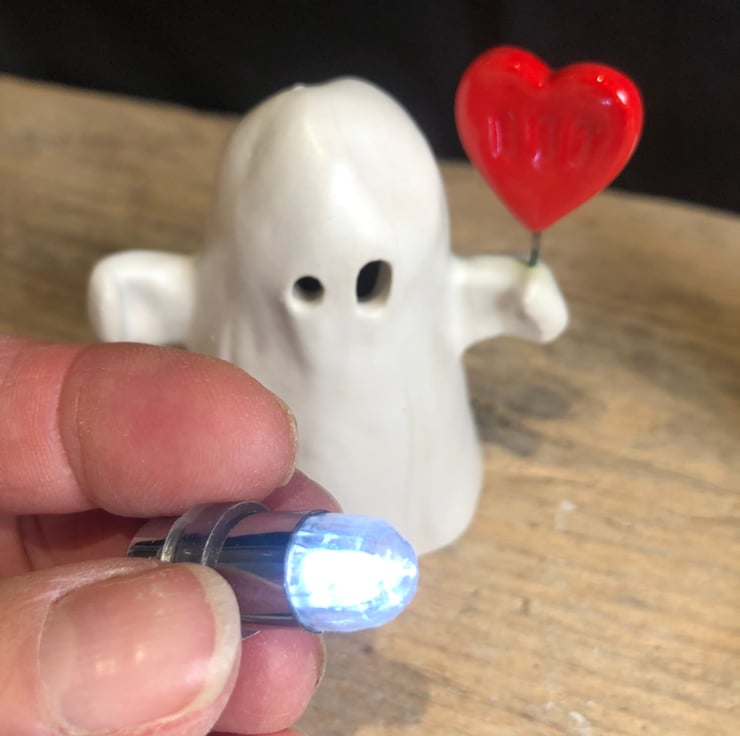 A cute handmade stoneware ghost holding a shiny heart - each one is unique!