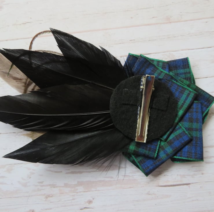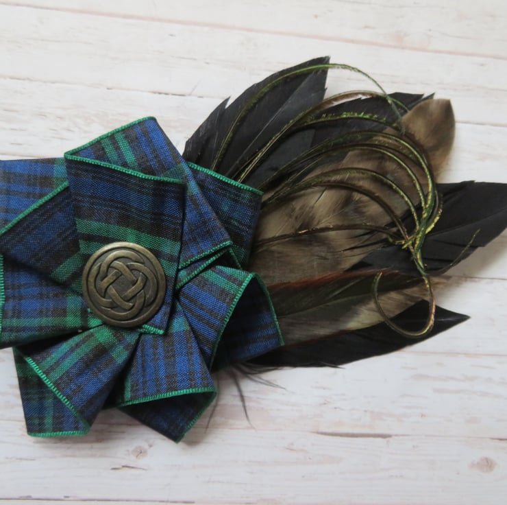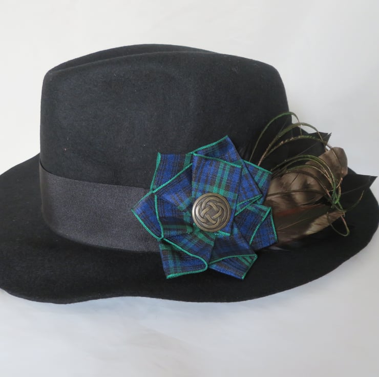 Complemented with a large Black Watch tartan ruffle made with 40 mm wide ribbon and finished with a large Brass Celtic button.