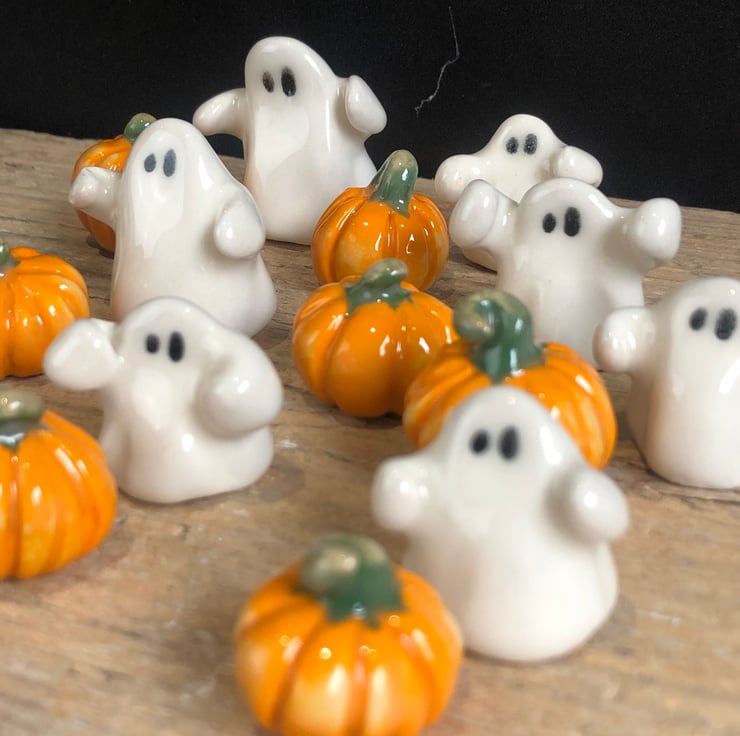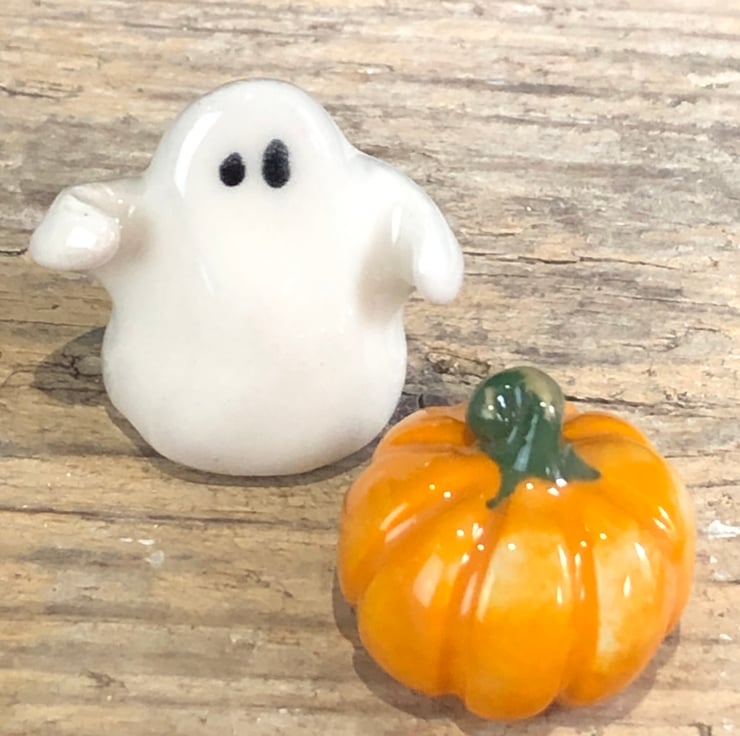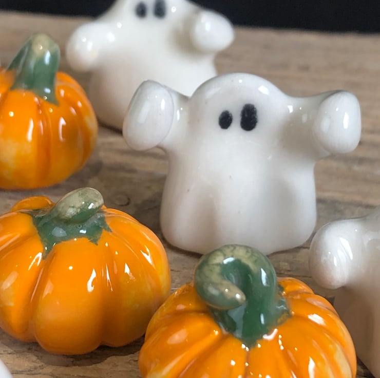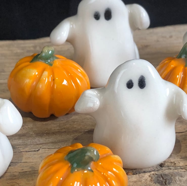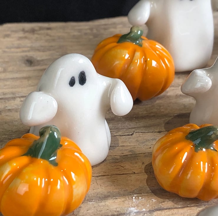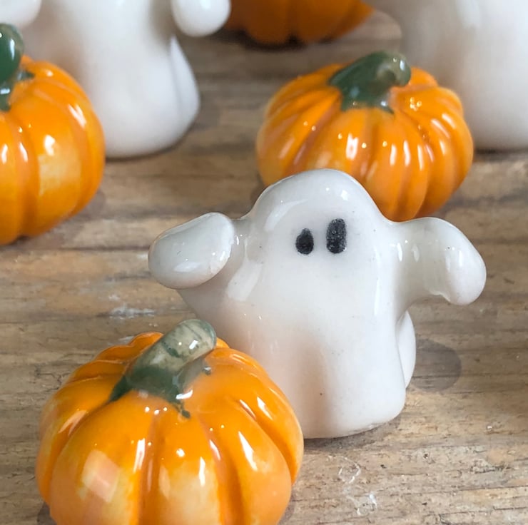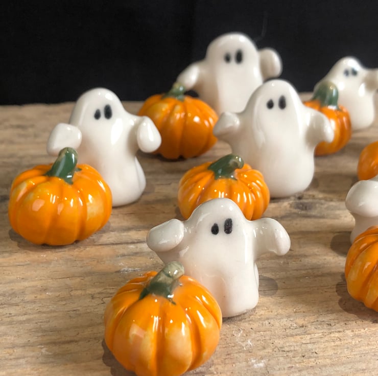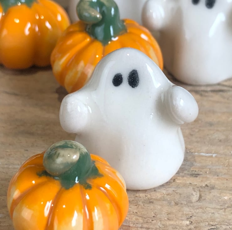 The cutest handmade ghost with arms outstretched & mini pumpkin set presented in a hexagon gift box with turquoise ribbon. Each one is modelled by hand and therefore completely unique.