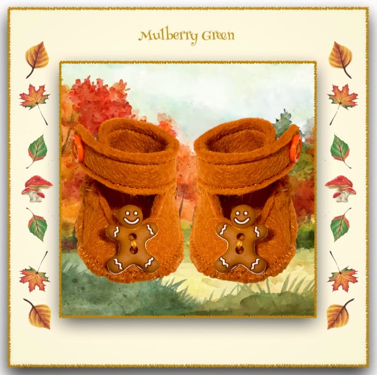 A little pair of tan shoes, decorated with little gingerbread men, to fit the Mulberry Green characters. The shoes look lovely with the little dresses.