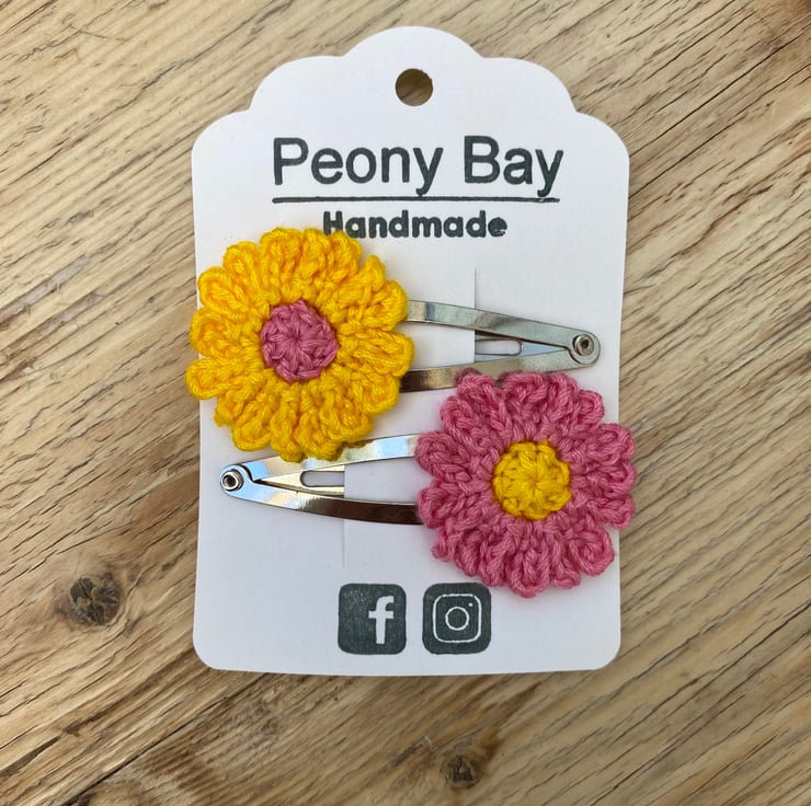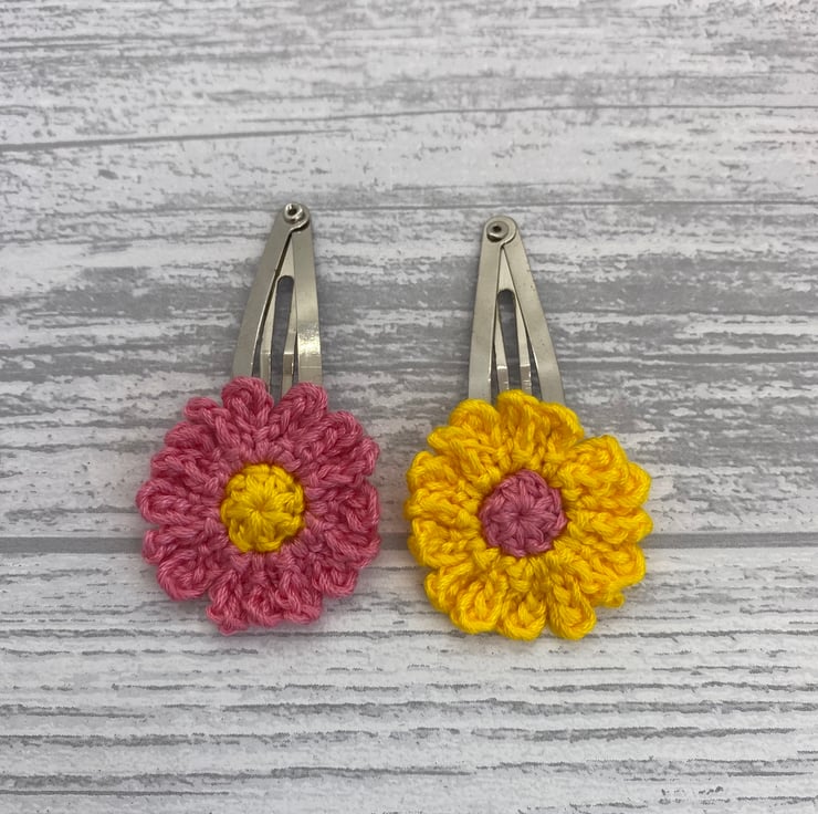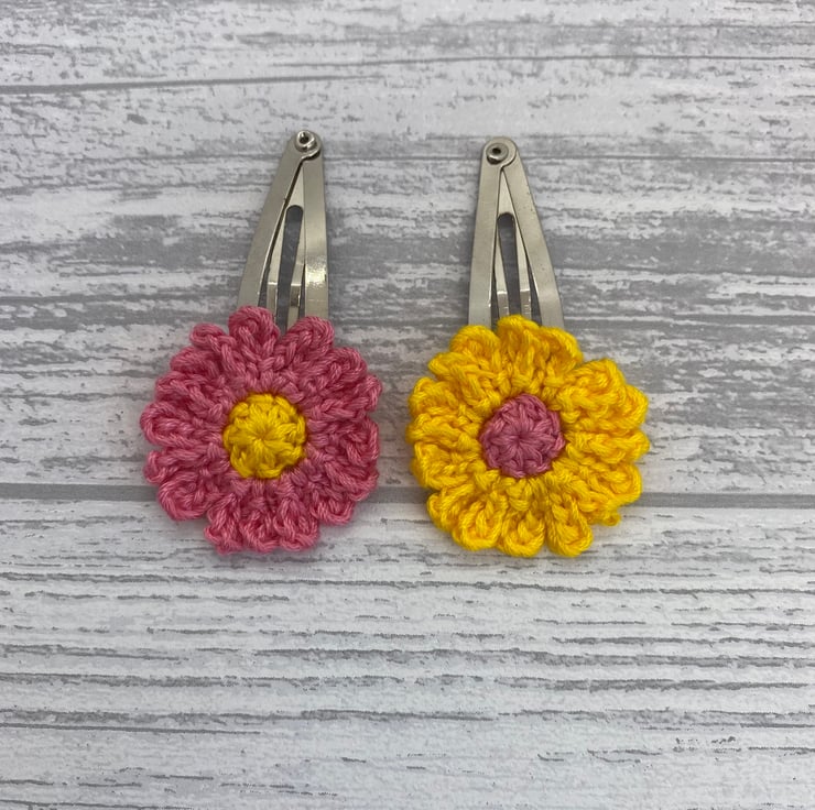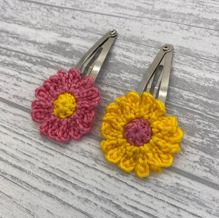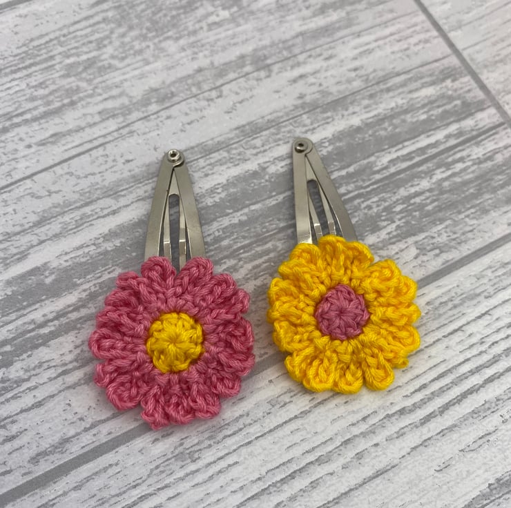 To make these hair clips I’ve crocheted daisy-type flowers in cotton, and set them on 5cm snap clips. The non-matching flowers are yellow and pink, and have 16 petals. The clips are silver tone.