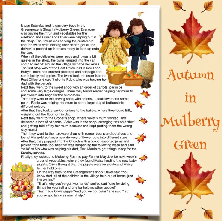 There are other children in Maisy’s class at school - Violet, Billy with his pet rabbit, Amber, Tilly, Rosie and her kittens, Amelia, Ruby, Marigold, Bobby with Max the dog, and the twins Oliver and Olivia, who have a puppy called Oscar. The dolls are all 26cm tall and baby Daisy is 16cm. Maisy and Mo love nothing more than having adventures with their friends. You can read about their adventures on my Facebook and Instagram pages - Maisy Muffin Rag Dolls and on my Mulberry Green Pinterest boards.