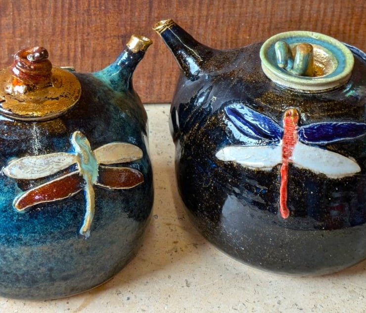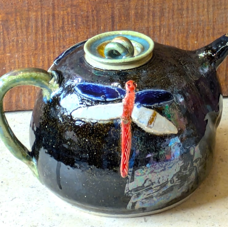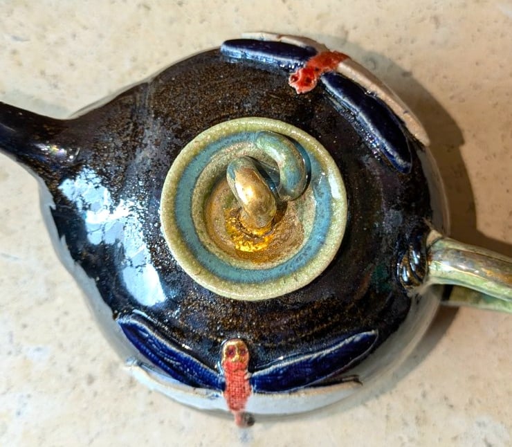 DFTP 1 A mottled shiny blue glazed teapot, decorated with 2 sweet dragonflies opposite one another. Gold luster on the twist style lid and spout tip. Glossy off white glaze inside. A good pourer.