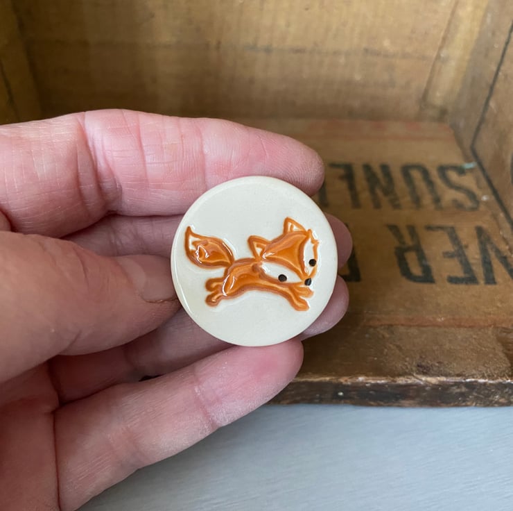 This listing is for a ceramic fox fridge magnet, made from white earthenware clay. It has a magnet glued to the back. They have been fired once to the bisque stage and then a second firing for the glaze. They measure approx 28mm diameter x 3mm deep.