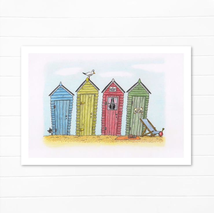 Seaside themed greeting card featuring a hand-drawn pencil illustration of four colourful huts, a cosy deck chair, a curious seagull, and two cute cats, making it a perfect card for any occasion.