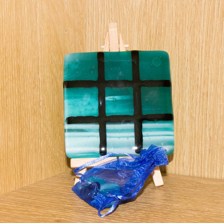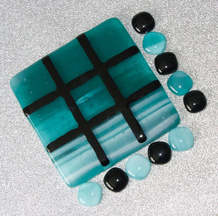 You won't need paper and pencil to play our version, as we'll provide the grid on a 10 cm square coaster. The background is a lovely streaky Turquoise, and the grid is made from black glass ribbons.