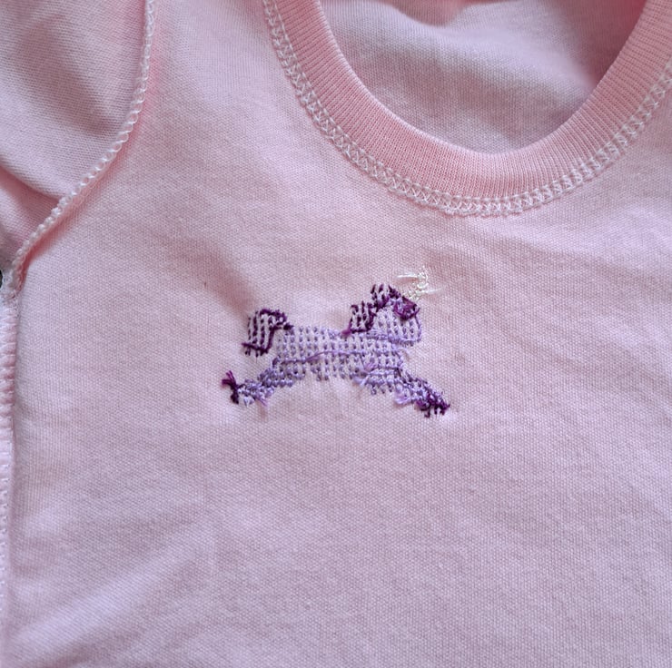 This is a very pretty light pink T-shirt, with short sleeves and a round neck. I have hand embroidered a mauve unicorn with a sparkly horn and deep purple mane, tail and hooves on the front. The shirt is 100% soft cotton and can be machine washed. As I never use a permanent backing material when hand stitching kids' clothing, there is nothing inside this shirt to irritate your child's skin.