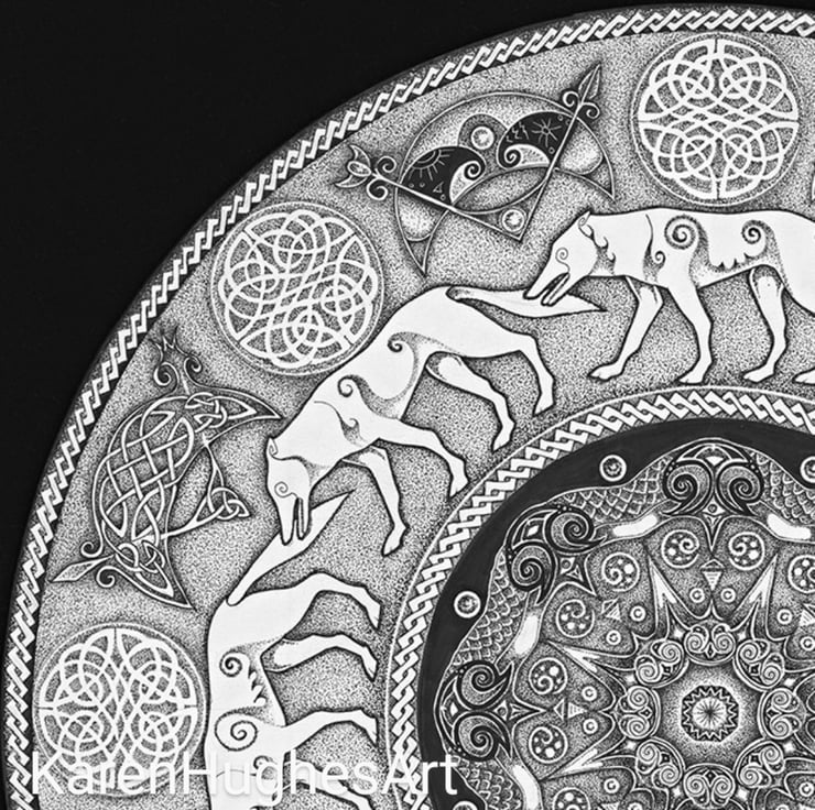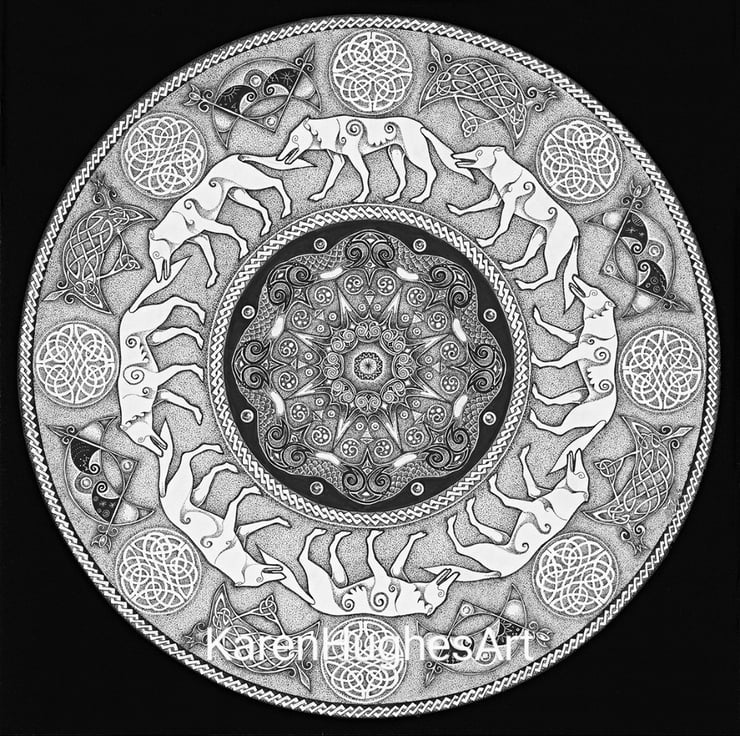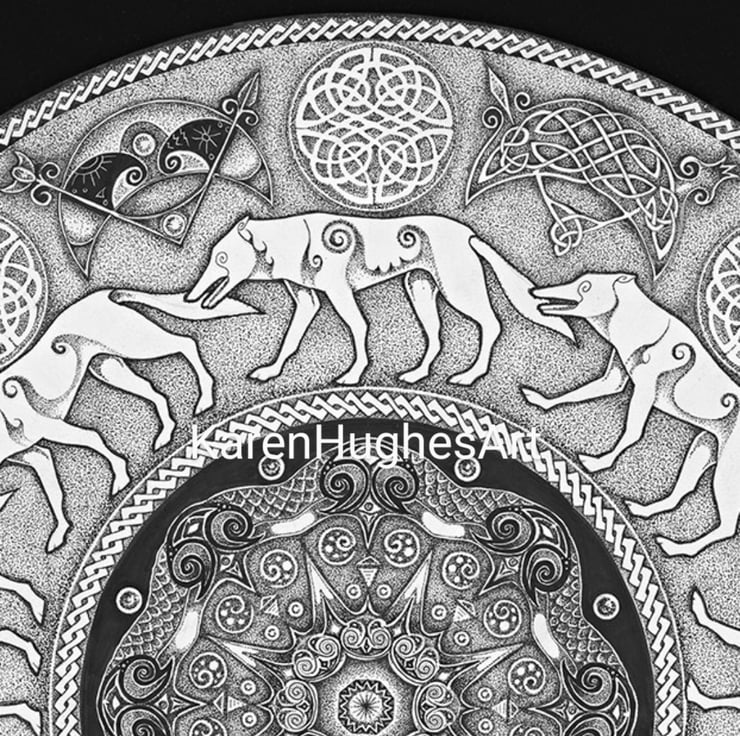 Inspired by the Ardross Wolf Stone. An incised symbol stone fragment of a prowling wolf, now on display in Inverness Museum and Art Gallery. Celtic knotwork, Pictish crescent and v-rod symbols and my imagination.