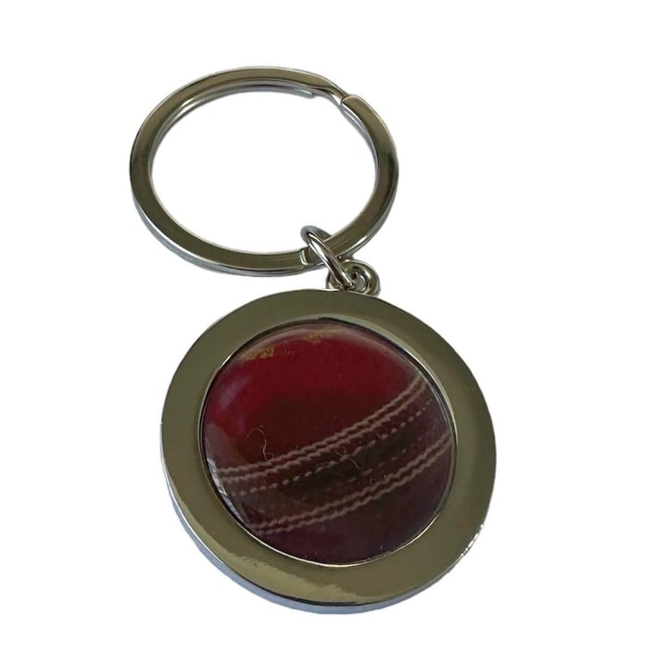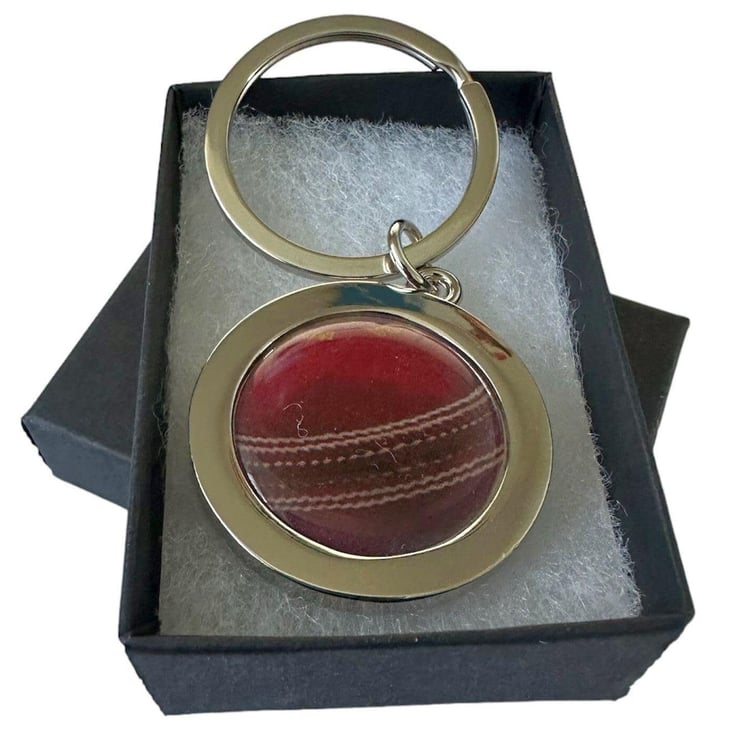This unique keyring is handmade with a silver plated base and features a cricket ball inspired design. Crafted with acrylic resin cabochon, this keyring is sure to add a touch of sporty sophistication to any outfit. The boxed gift makes it a perfect present for cricket enthusiasts.