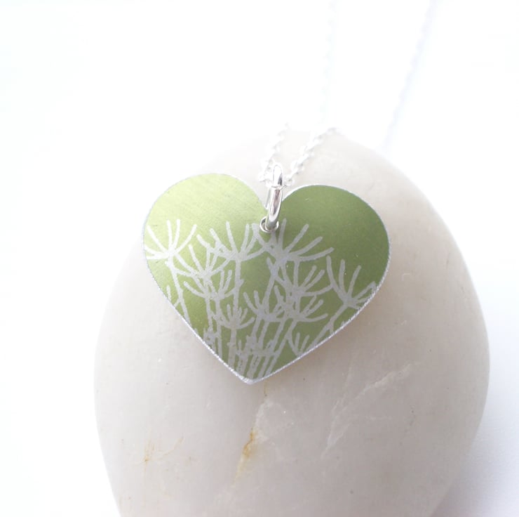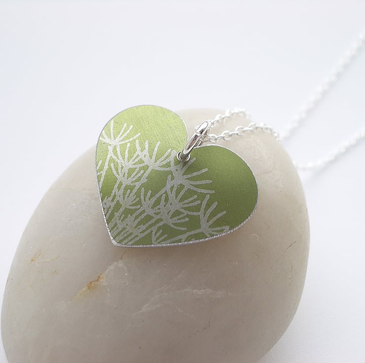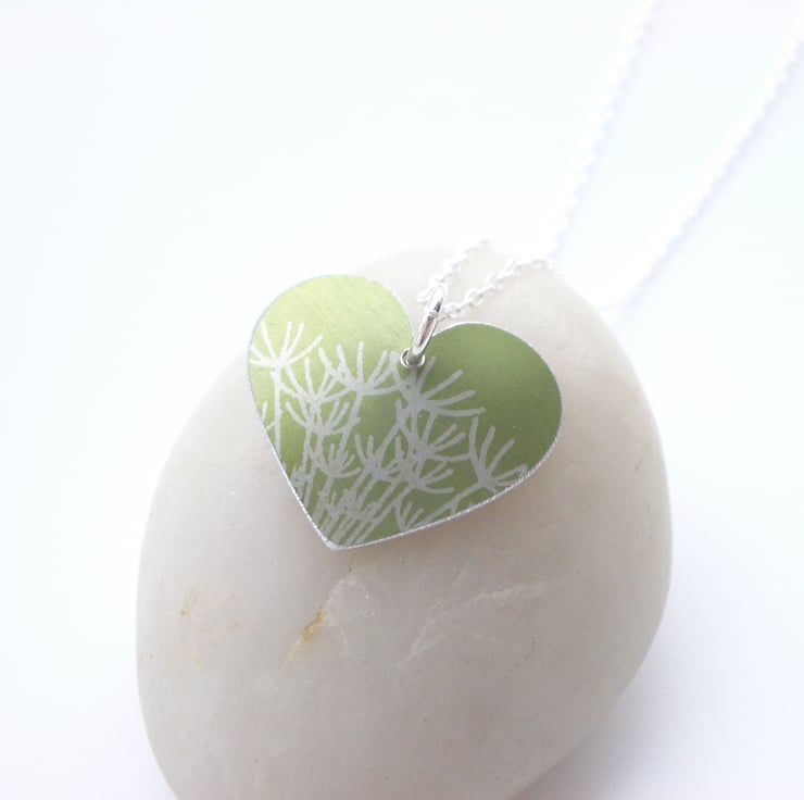 This simple pendant is hand made from aluminium which I have dyed a in a soft green and printed with a pretty dandelion seed heads design. I saw pierce by hand the heart shape and dome it so that it catches the light.